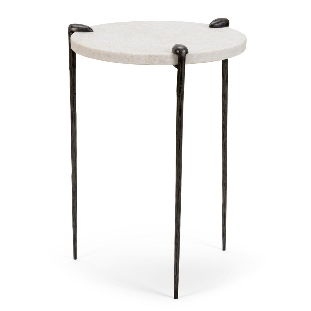 This table from Wildwood brings lavish texture to a bedroom or living room. A handsome furnishing to serve as a surface for a lamp or books, this table expresses chic style. Iron side table with raw steel or antique gold finish and a natural white marble top.
