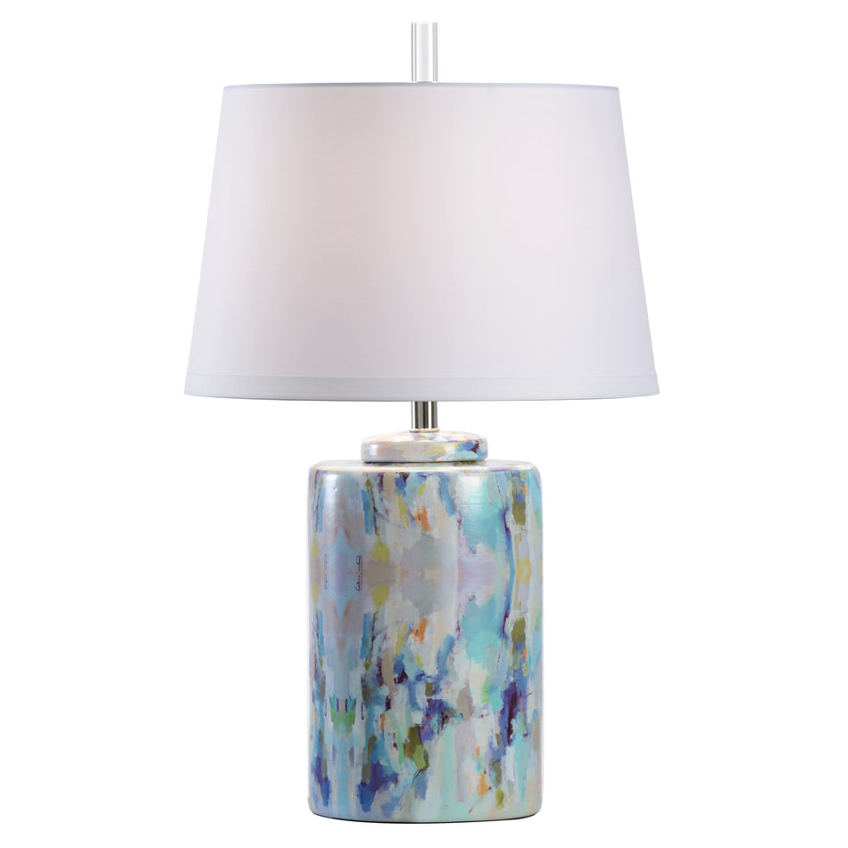 This Wildwood table lamp combines everyday function with high style. Elegant and elevated, this lighting fixture delights atop a nightstand or end table. The Wildwood Wintergreen Cylinder table lamp was inspired by the vibrant yet calming colors of the beach. The Wintergreen lamp portrays a fresh two-toned color way of blue and greens.