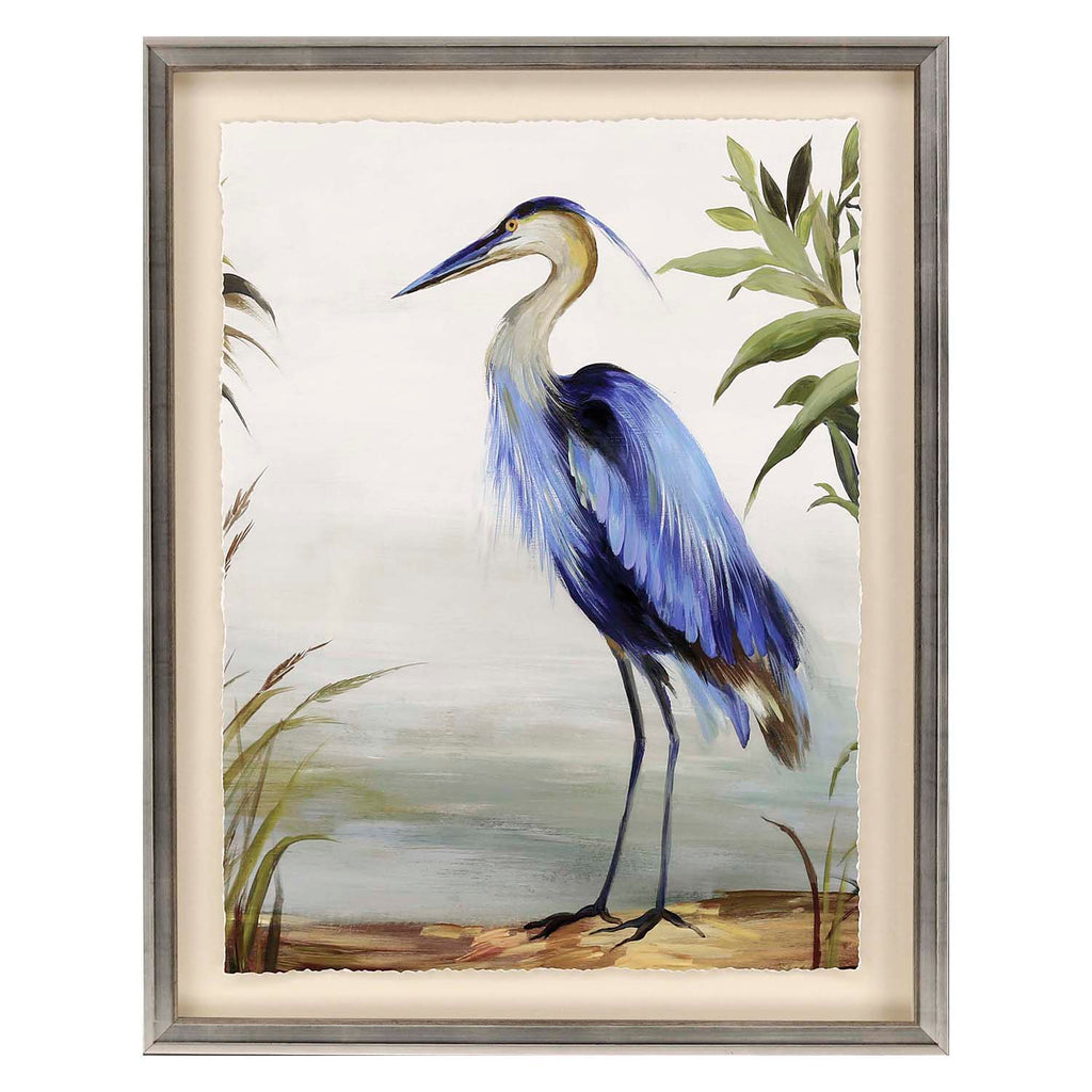 A majestic heron is hand deckled and float mounted with ivory matting. Framed in a silver leaf wood shadow box style molding with gold wash edging.