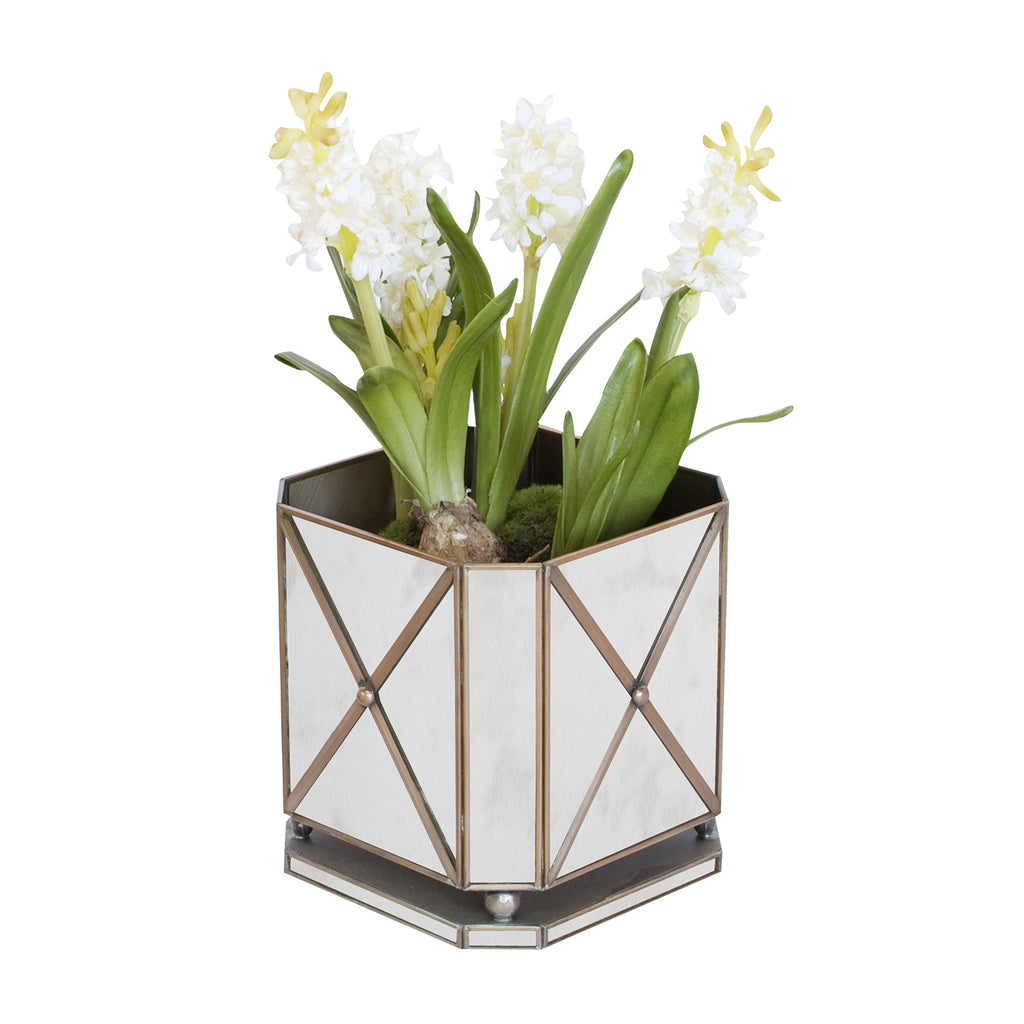 Bring a touch of French provencial living to your indoor or outdoor garden room. This Regency style square planter perched atop ball feet and finished with a crosshatched pattern and antique mirrors.