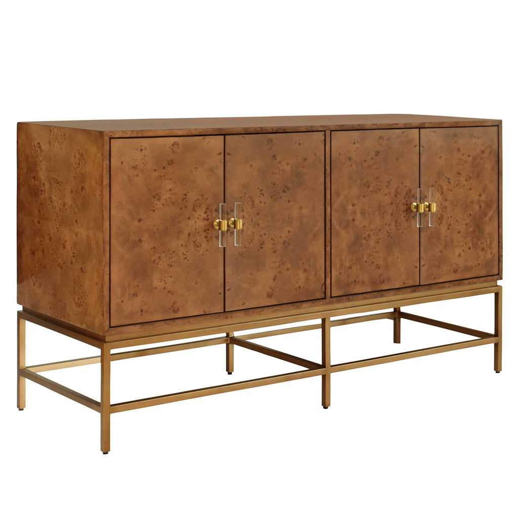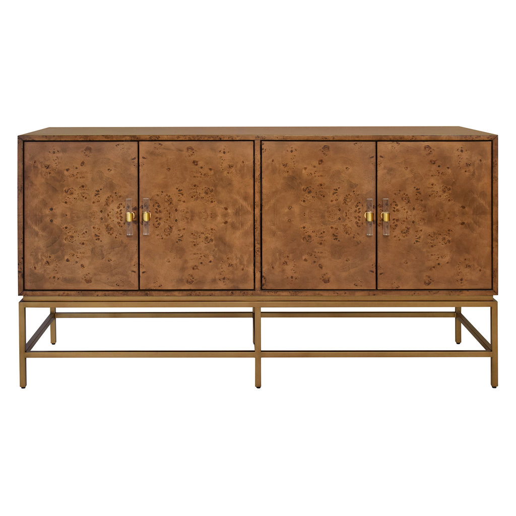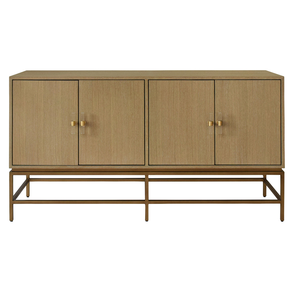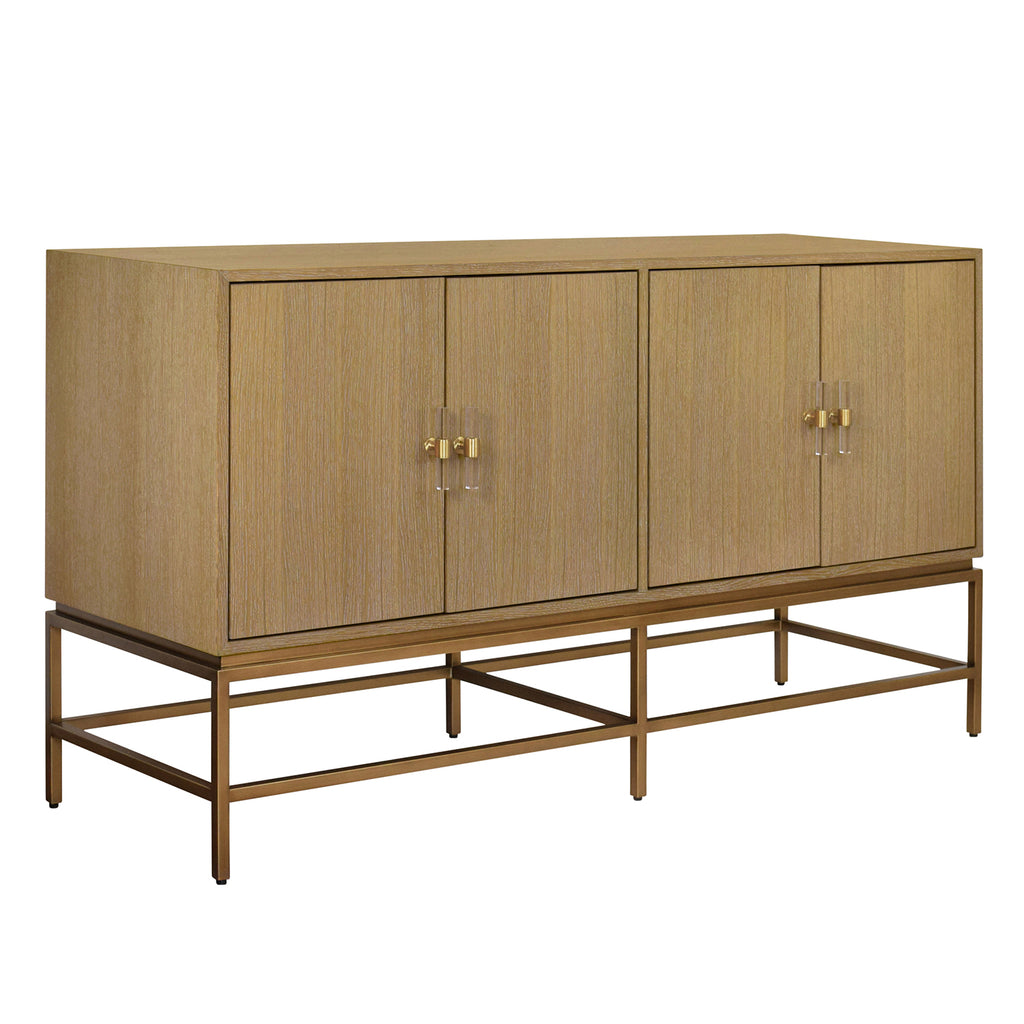 • Four Door Buffet with Antique Brass Metal base in Cerused Oak or Dark Burlwood.