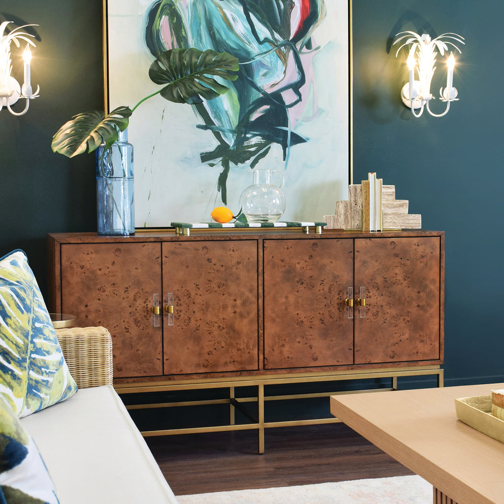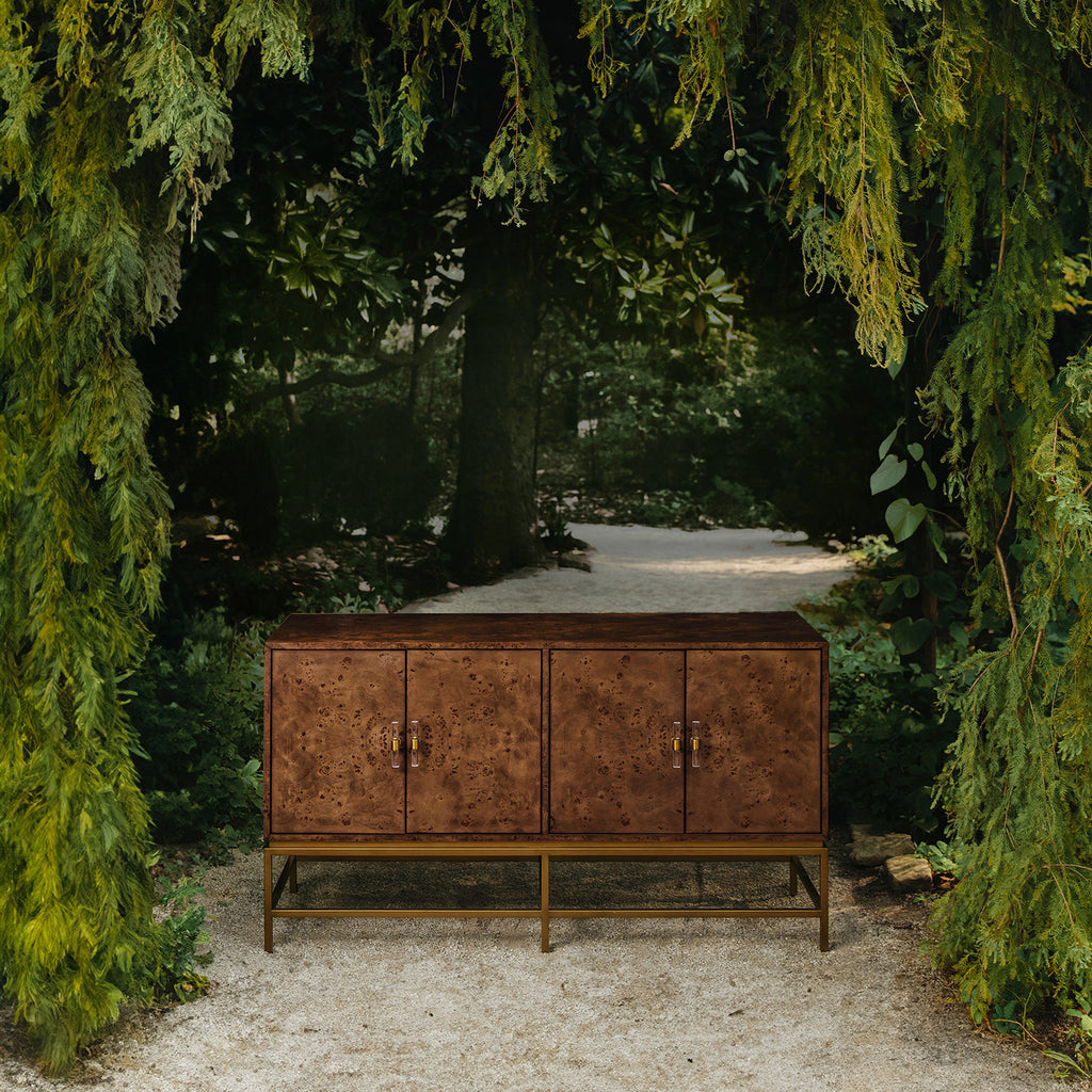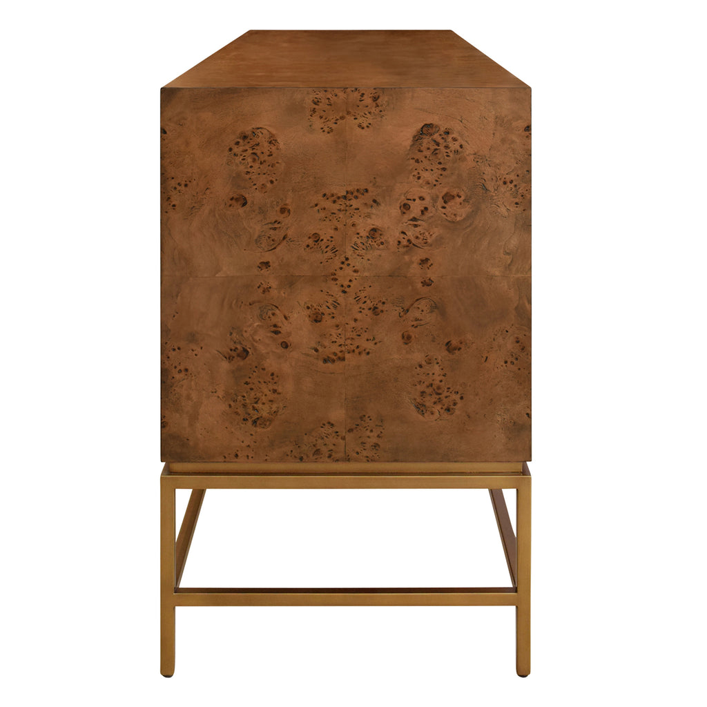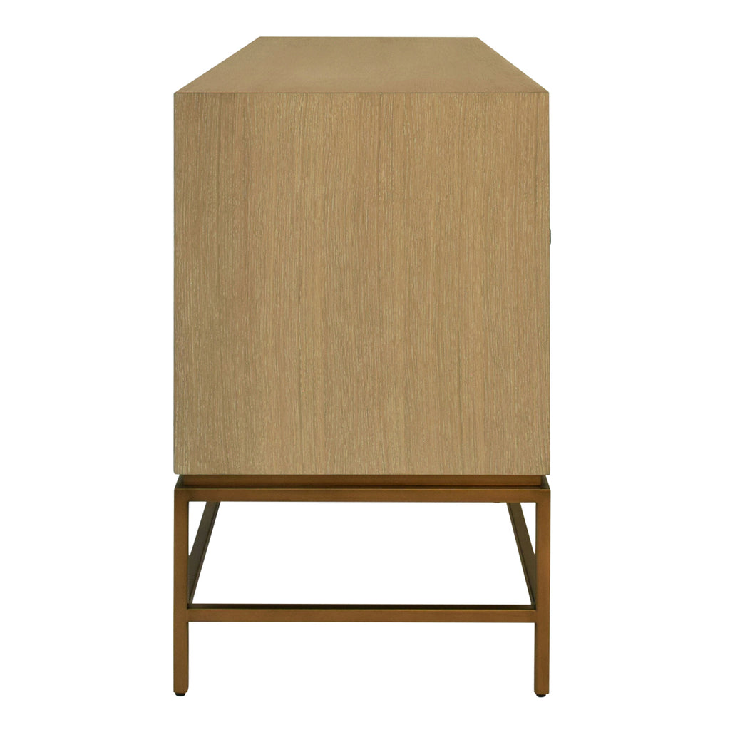 • Four Door Buffet with Antique Brass Metal base in Cerused Oak or Dark Burlwood.