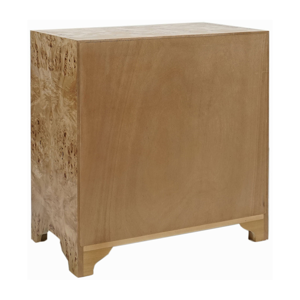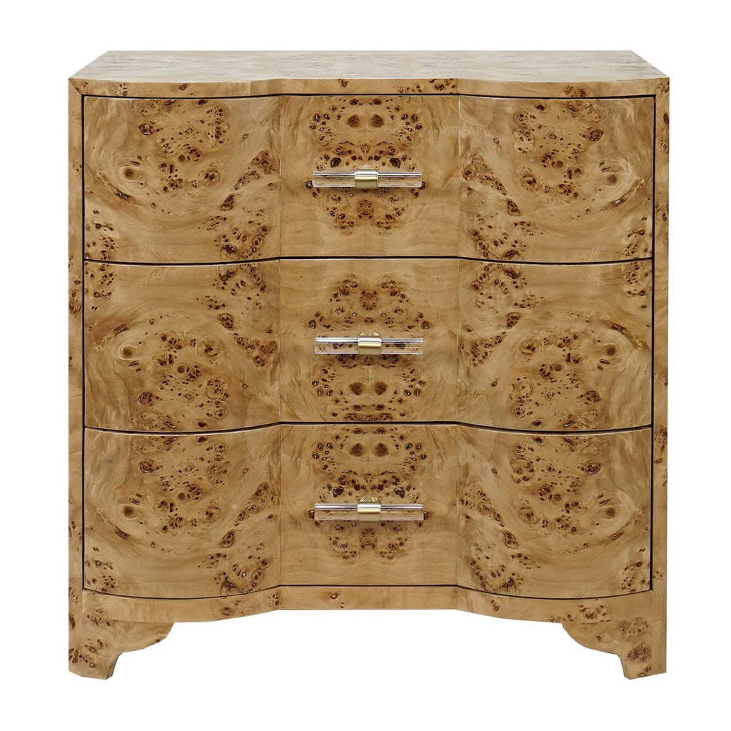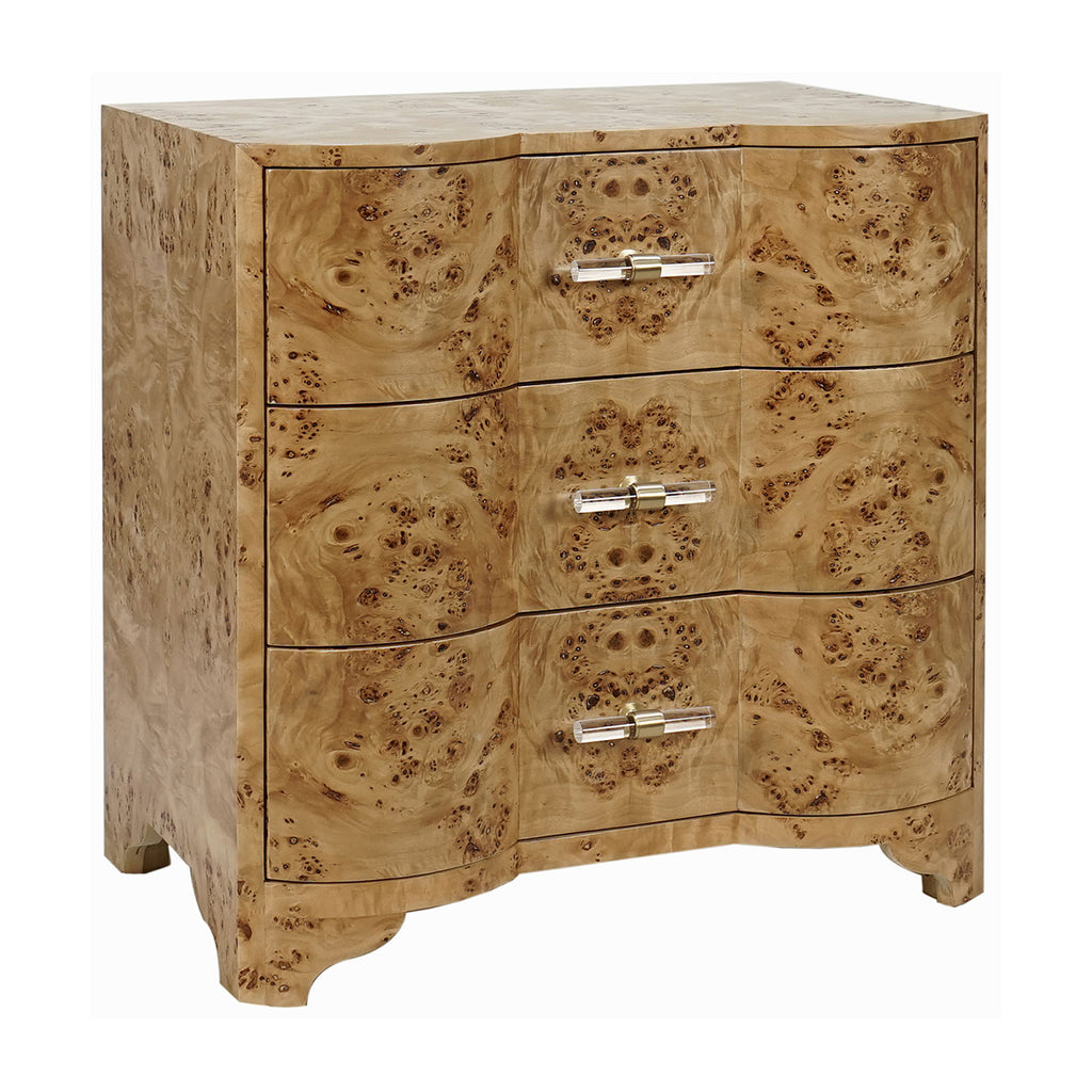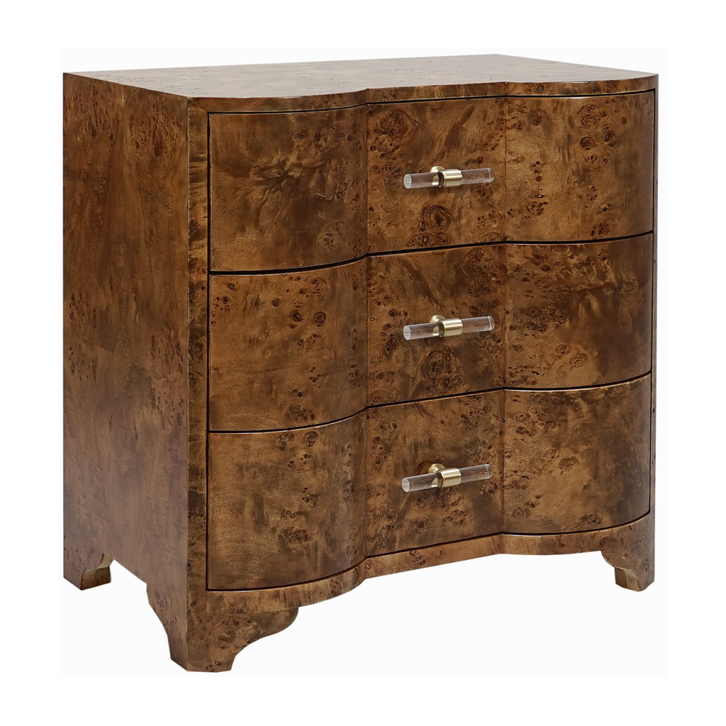 Worlds Away's contemporary glamor comes to life upon this gorgeous side table. Its eclectic textures complement a range of styles, making it the perfect addition to a bedroom or living room. Clean, elegant lines give this furnishing an elevated finish. The stunning Worlds Away Calvin three drawer side table is a modern heirloom in the making! Distinctive, serpentine profile is dressed in exquisite, matte burl finish or matte dark burl wood and accented with acrylic cylinder & brass hardware. Three generously scaled drawers make Calvin an elegant storage solution for any interior.