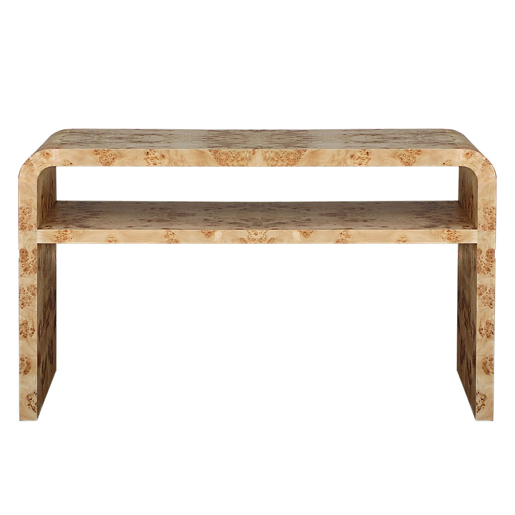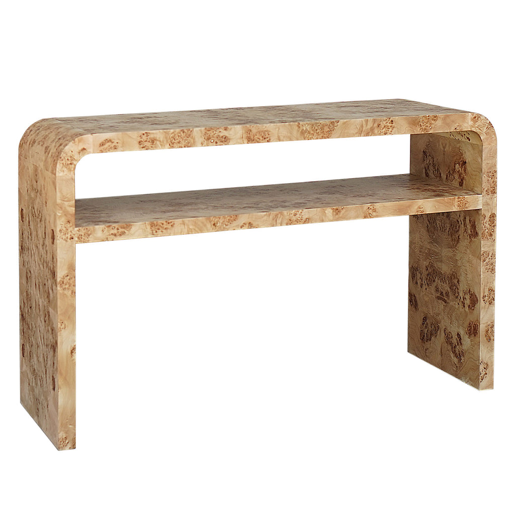 This console table from Worlds Away accents foyers, living rooms and hallways with alluring dazzle. Slim, contemporary lines give this table a touch of minimalist modernity, while eclectic texture makes it an unforgettable addition to the home. Waterfall edge two tier console table in burlwood.