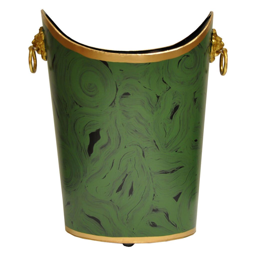 Worlds Away lends its one-of-a-kind elegance to your home with this sophisticated wastebaskets. Abstract and elegant, this modern accent delights with fresh, striking style. Oval wastebasket with raised ends and lion handles in malachite.