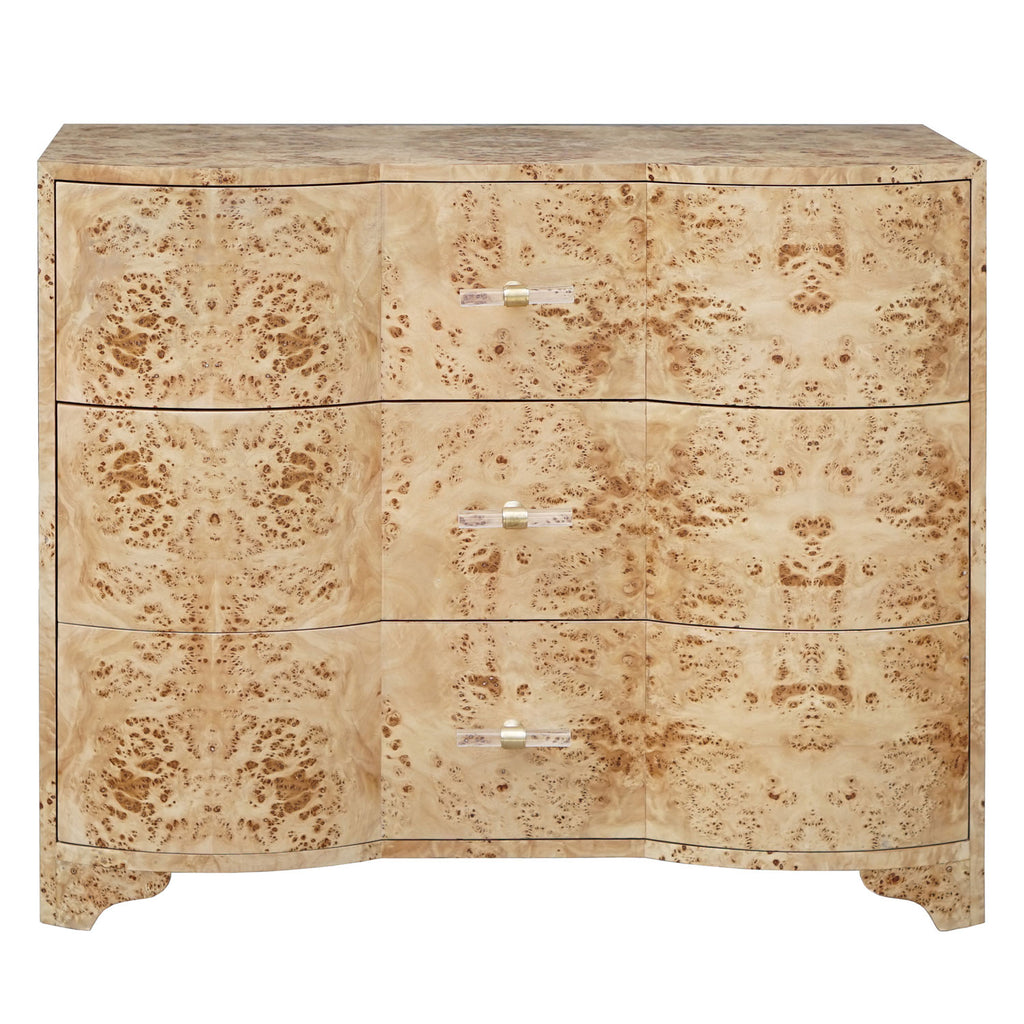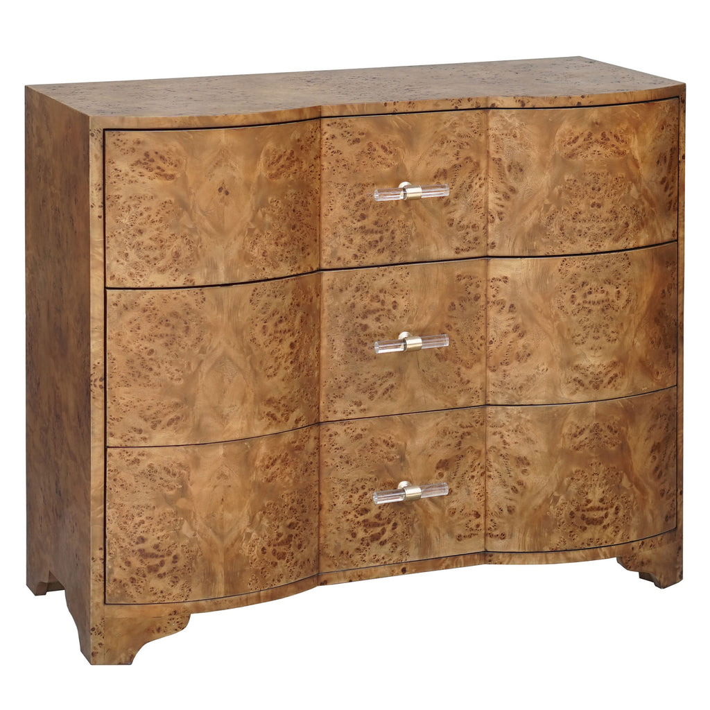 Give your bedroom or guestroom a stylish storage space with this dazzling chest from Worlds Away. On a simple silhouette, bold geometric details invite attention for a gorgeous statement. Drawers open to provide storage. Three drawer chest in burlwood or dark burlwood with acrylic hardware.