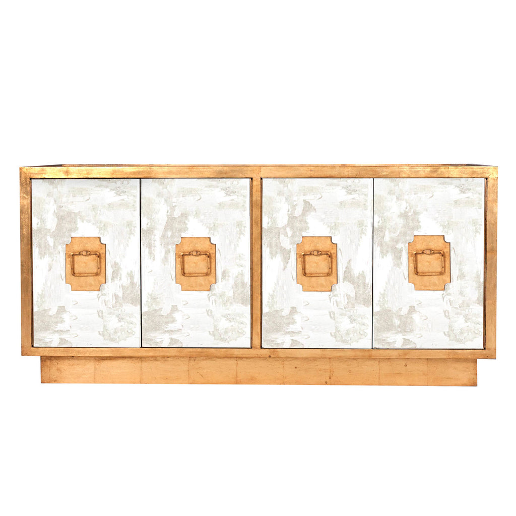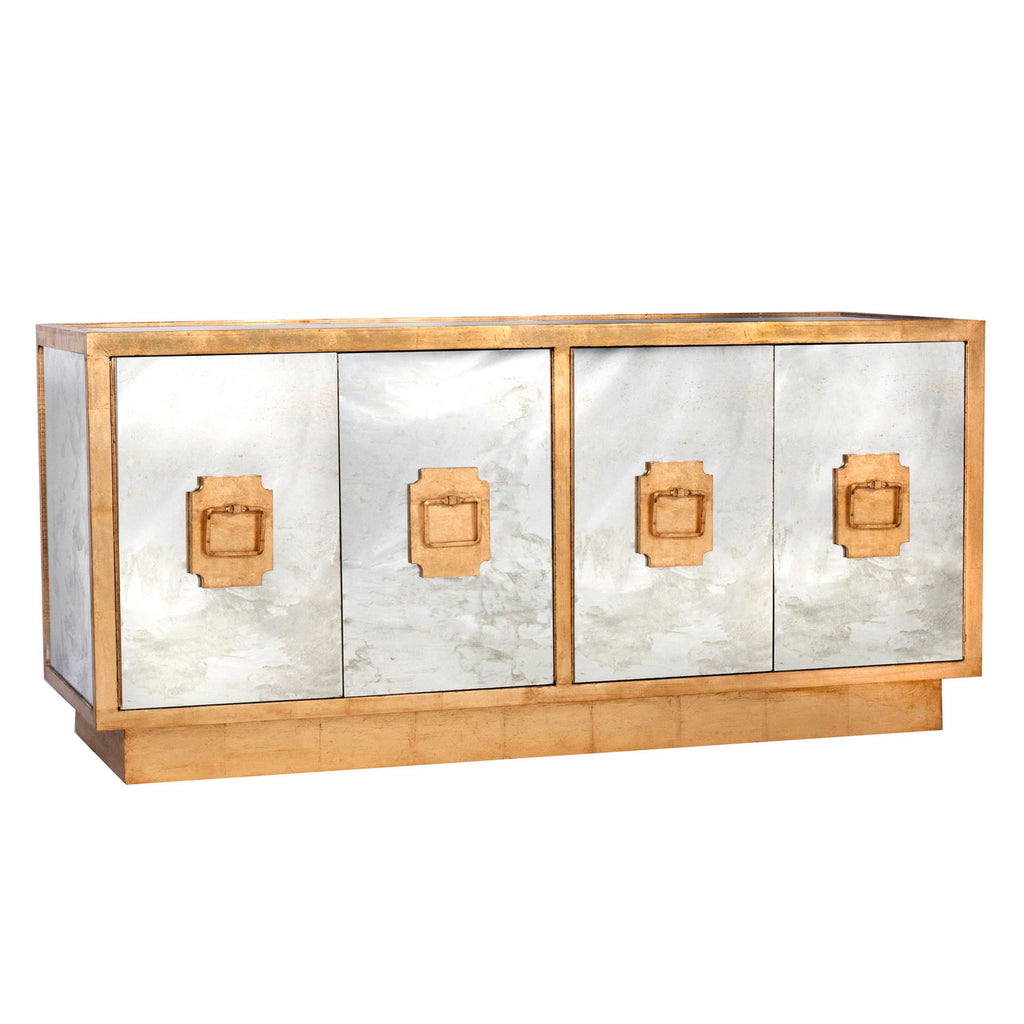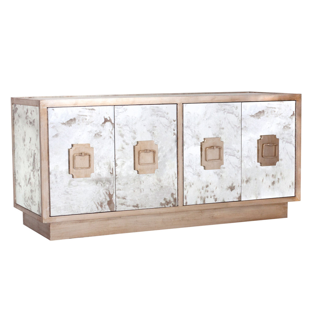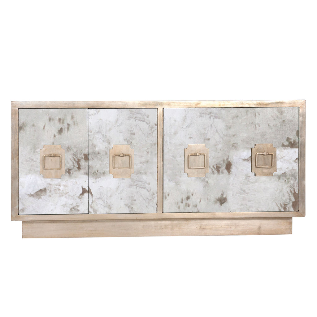 Give your living room a sophisticated statement piece with this media center from Worlds Away. Dazzling in design, this chic console delights with eye-catching angles for geometric allure. Its cabinet doors open to offer extra storage space. Entertainment 4-door console with antique mirror and gold leaf or silver leaf. Fixed interior shelf.