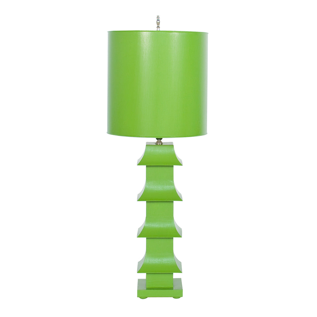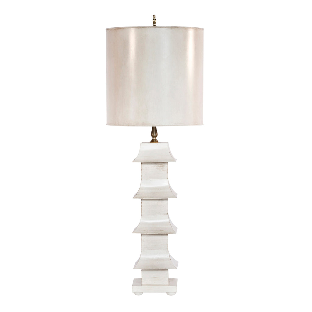 Tiered and towering with four elegant eaves, our slim, antiqued Pagoda-style lamp is a study in modern antiquity. Topped with a painted tole shade, nickel harp and finial.