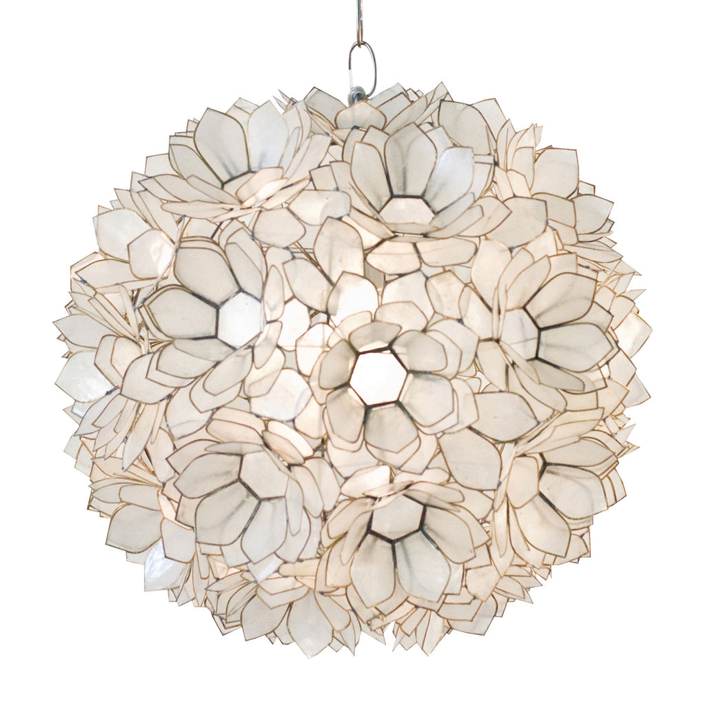 This Worlds Away pendant combines chic function and style to light up a living room, dining room or hallway. Bold geometric lines captivate, making it a statement accent in any space. Its abstract style lends a sophisticated, elevated vibe. Lotus capiz pendant.