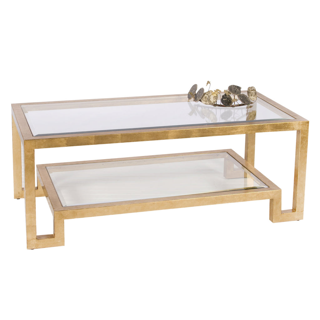 From Worlds Away, this coffee table offers a dazzling presence to a living room. Sleek and elegant, this chic furnishing expresses bold modernity with geometric style. Its minimalist silhouette makes it a transitional piece for your space. Gold leaf 2 tier coffee table with beveled glass top.