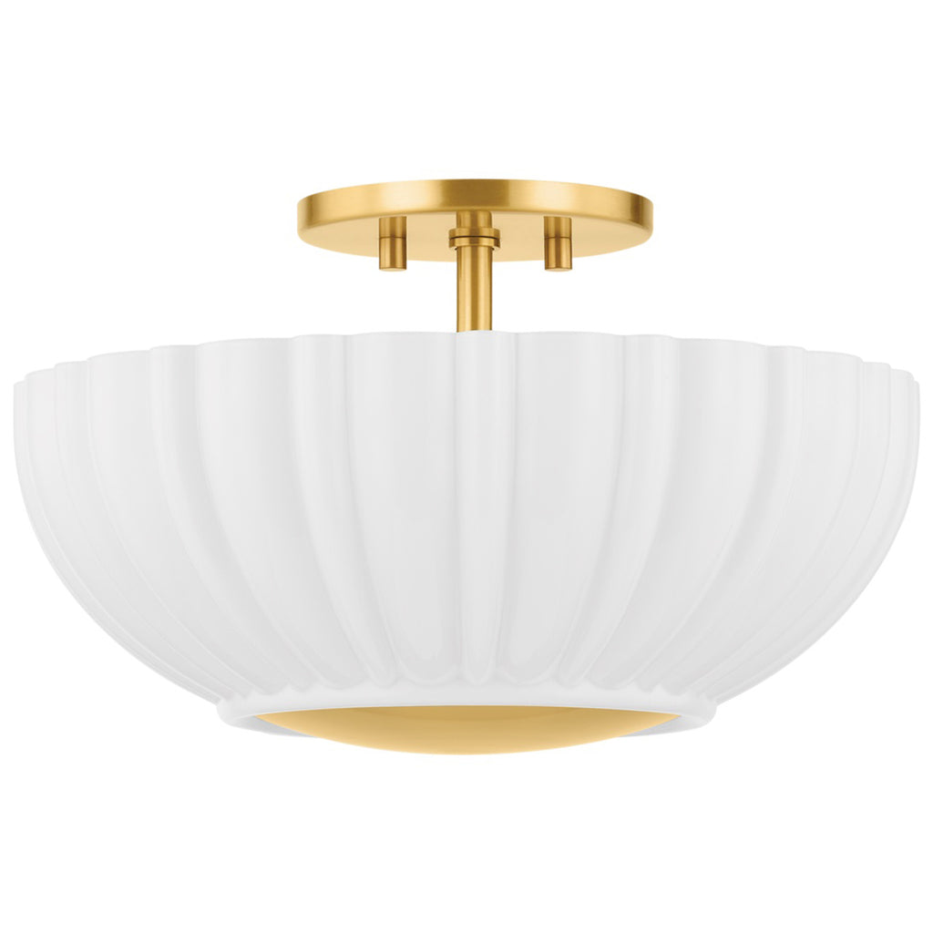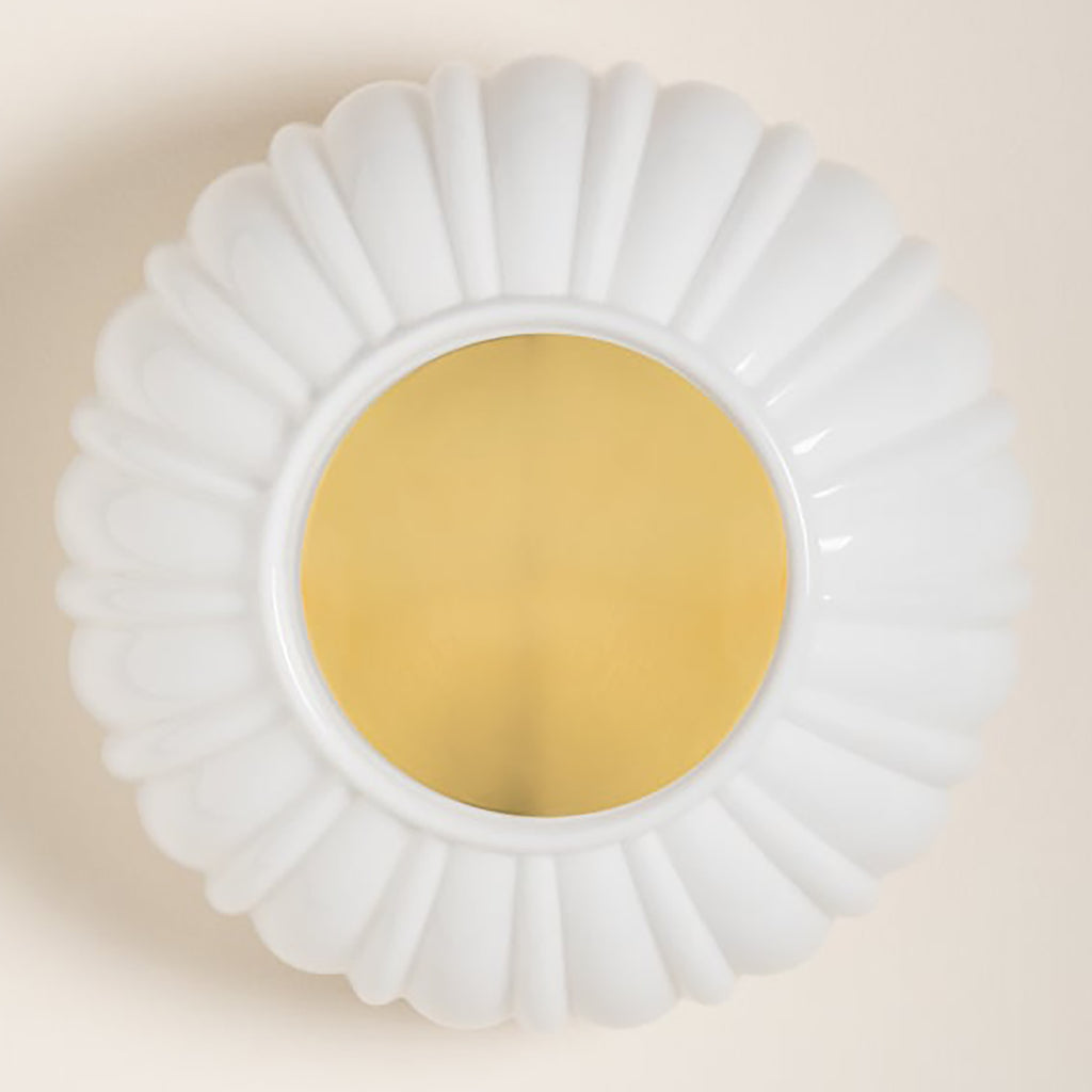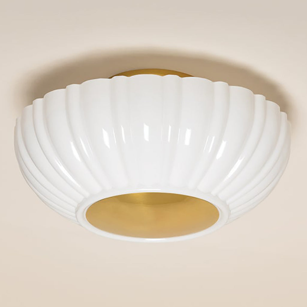Recalling Art Deco designs, this decorative flush mount features a large Opal Shiny Glass shade with fluted edges. The metalwork is finished in timeless Aged Brass, adding a luxurious note. Mitzi Anne Flush Mount provides warm illumination to a living room, bedroom, or office space. Part of our Zoe Feldman collection.