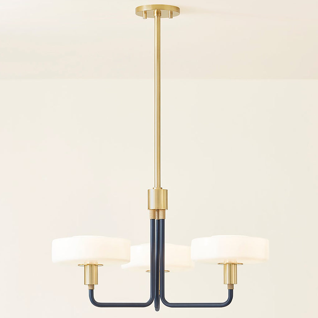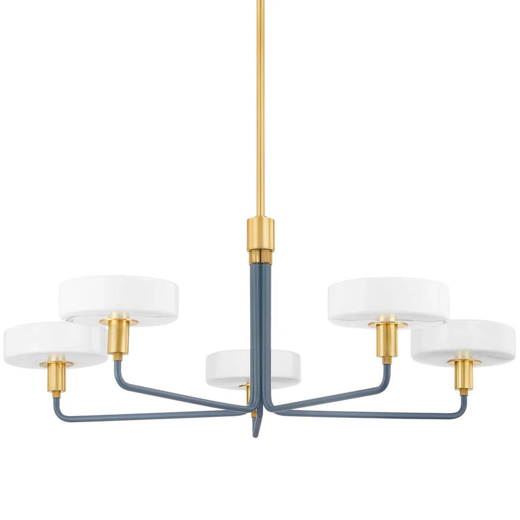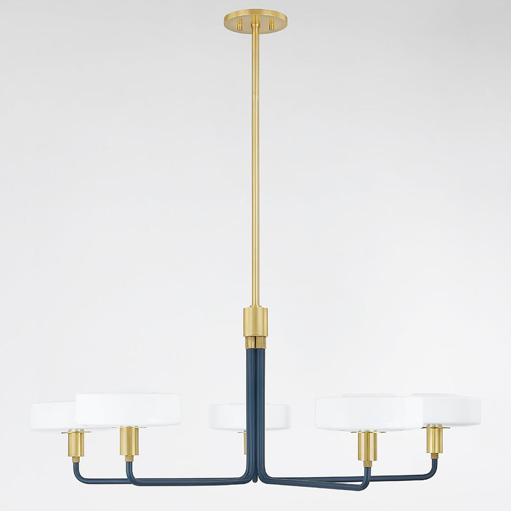 A modern statement piece in stylish Slate Blue, Mitzi Aston Chandelier features thick pillow-shaped shades made of Opal Shiny Glass balanced on a softly geometric frame. Sleek lines, right angles, and warm Aged Brass accents contribute to the striking stature of this fixture. Available as a sconce, 3-light and a 5-light chandelier, Mitzi Aston Chandelier fills any space with a warm glow. Part of our Zoe Feldman collection.