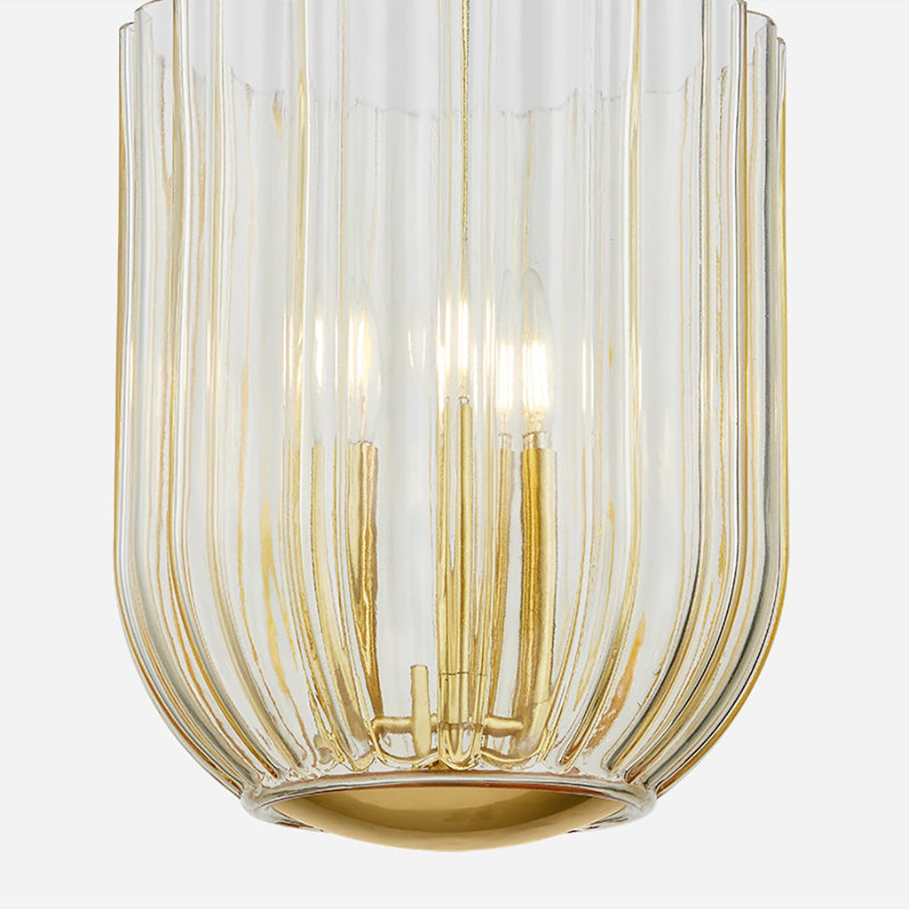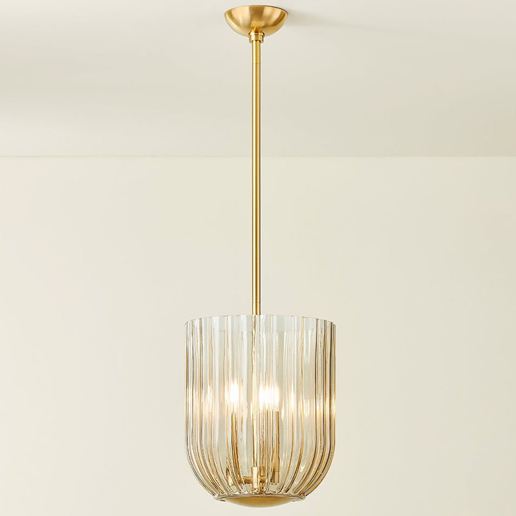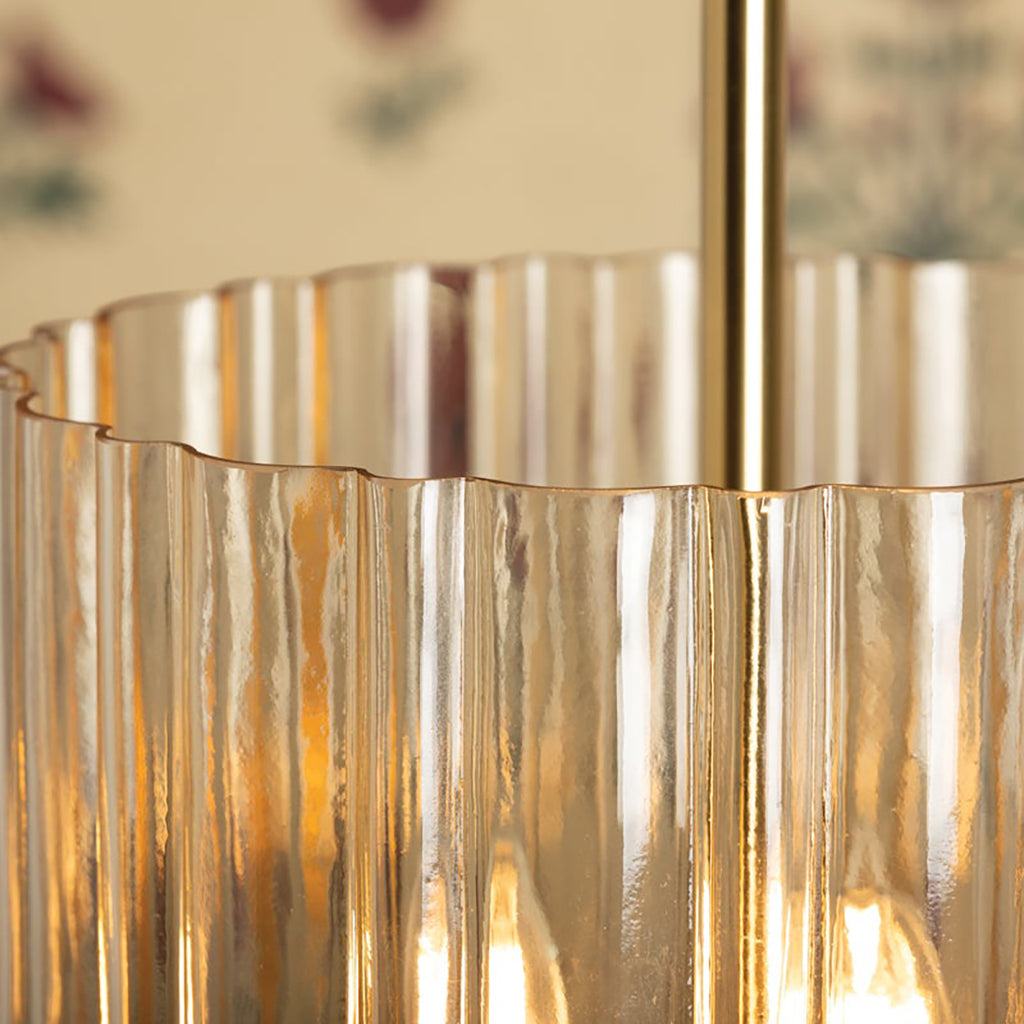This floral-inspired lantern will flood your living spaces with soft, ambient light. This fixture provides a radiant glow that shines through the champagne glass of the large, delicately scalloped shade. Coordinating in tone with the glass, the Aged Brass rod adds a clean point of contrast to the softness of the shade. Part of our Zoe Feldman collection.