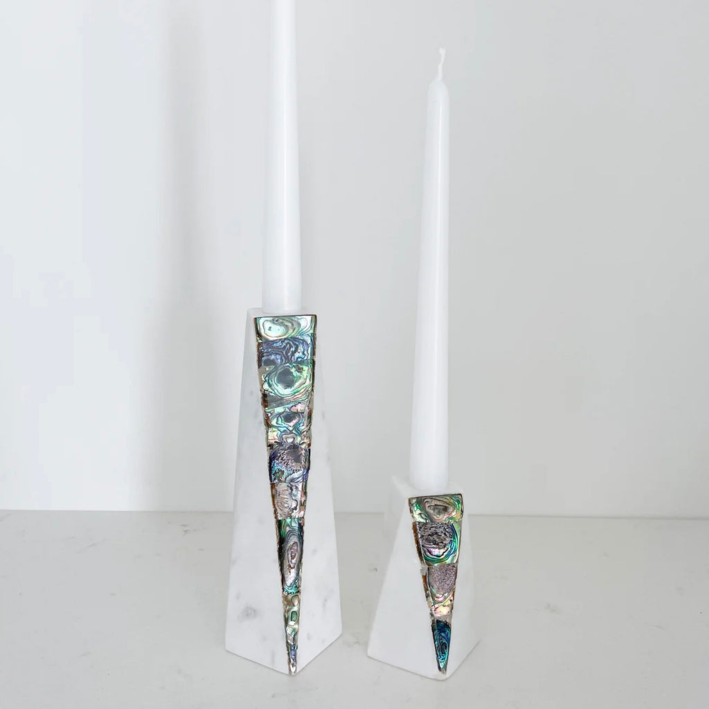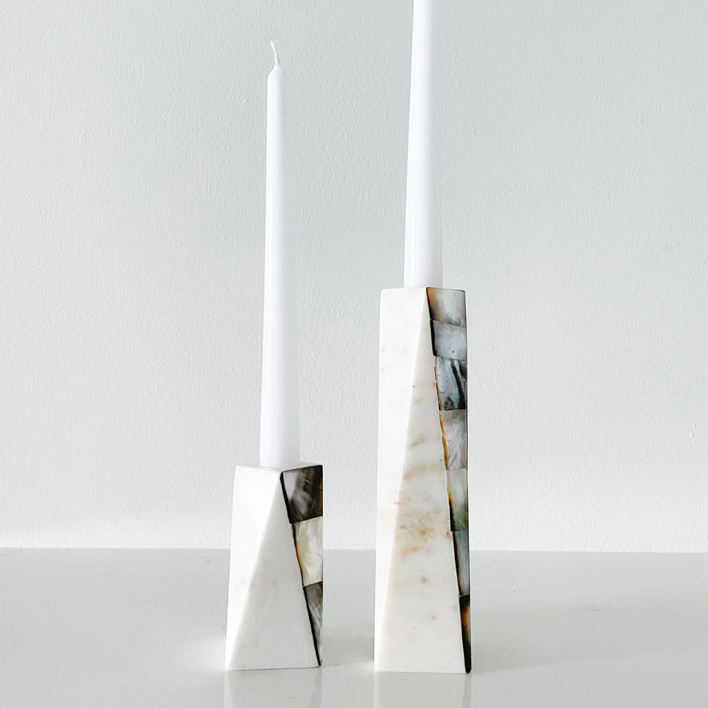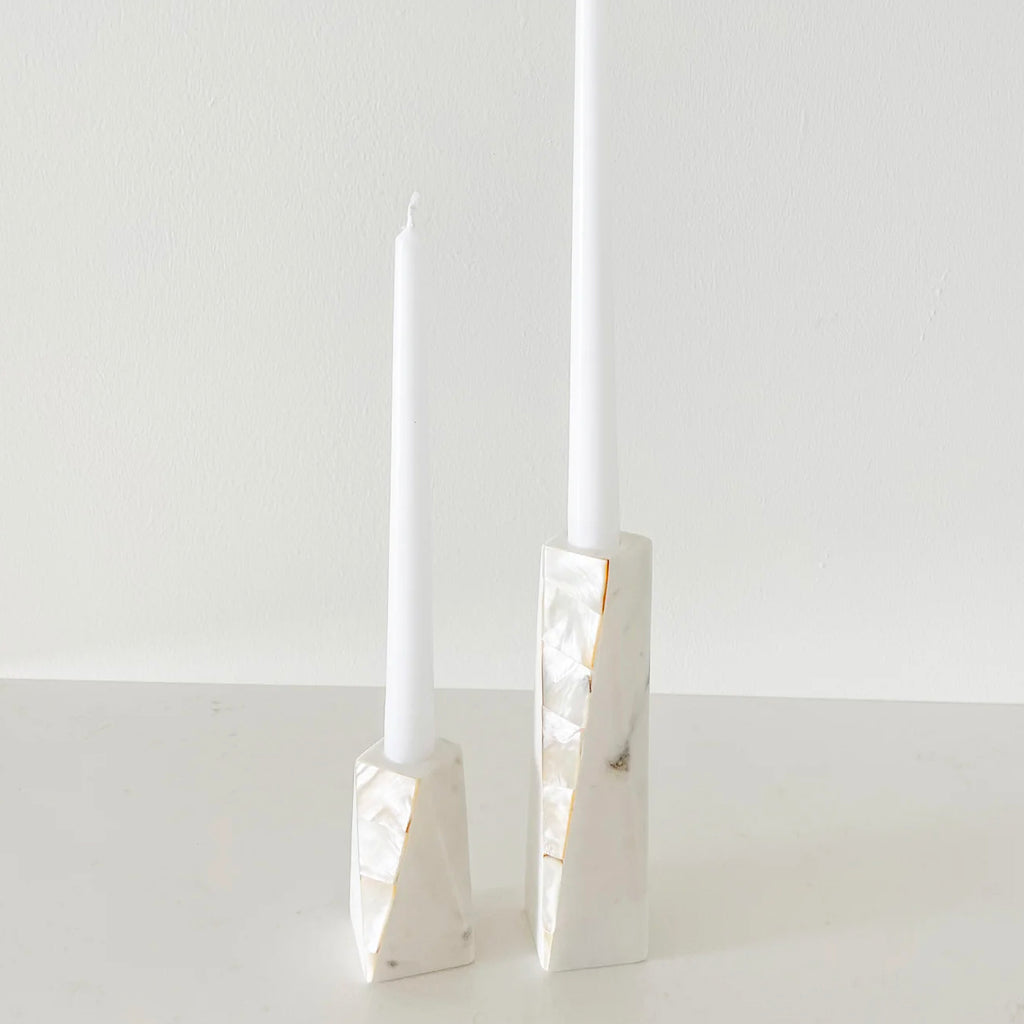 The Mother of Pearl White Marble Candle Holder is accented with iridescent rainbow color tones, grey with hints of light golden accents or white color tones with hints of light golden accents