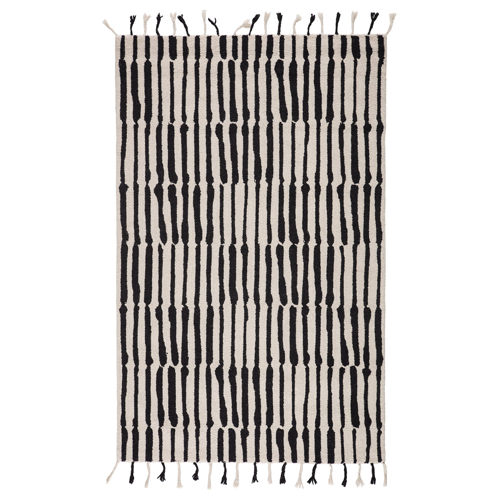 Hand tufted of wool, the Jaipur Vera collection by Nikki Chu infuses contemporary spaces with inspiring patterns and versatile colorways. A fusion of abstract modernity and tribal motifs, the Saville rug features a classic black and ivory colorway for bold contrast and striking visual texture. Long, braided tassels add boho-chic charm to this worldly rug.