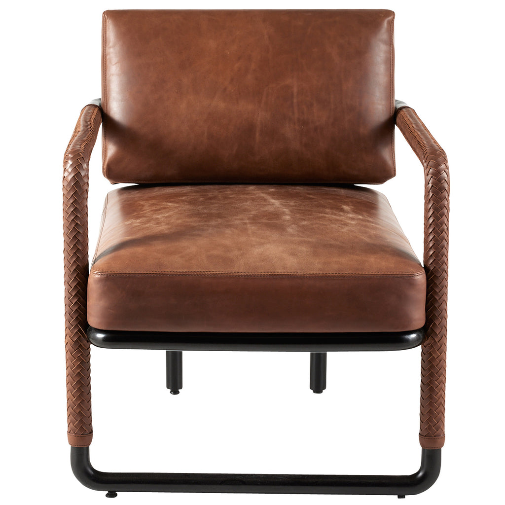 The classic leather club chair, updated with modern open arms and pieced details. Tactile braided leather of a rich cognac hue on each arm complements its sturdy mid-century lines. An open frame of blackened bronze stainless steel makes this generously scaled seat both airy and easy to place. Finish will vary.