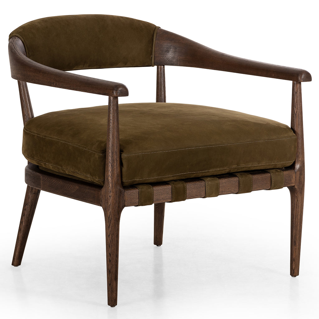 Safari styling is brought to modern speed on this vintage-inspired chair. Its solid wood frame features a webbed seating structure that brings a sink-in feel to the entire piece. The upholstered back, strap details and loose cushion are finished in a rich Italian-made leather with a soft, buttery feel and subtle highs and lows throughout the hide that bring movement to the entire piece. Leather is treated for water repellency.