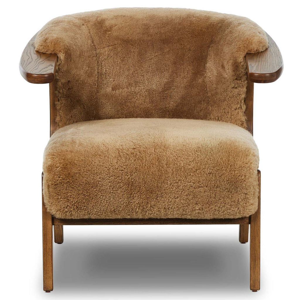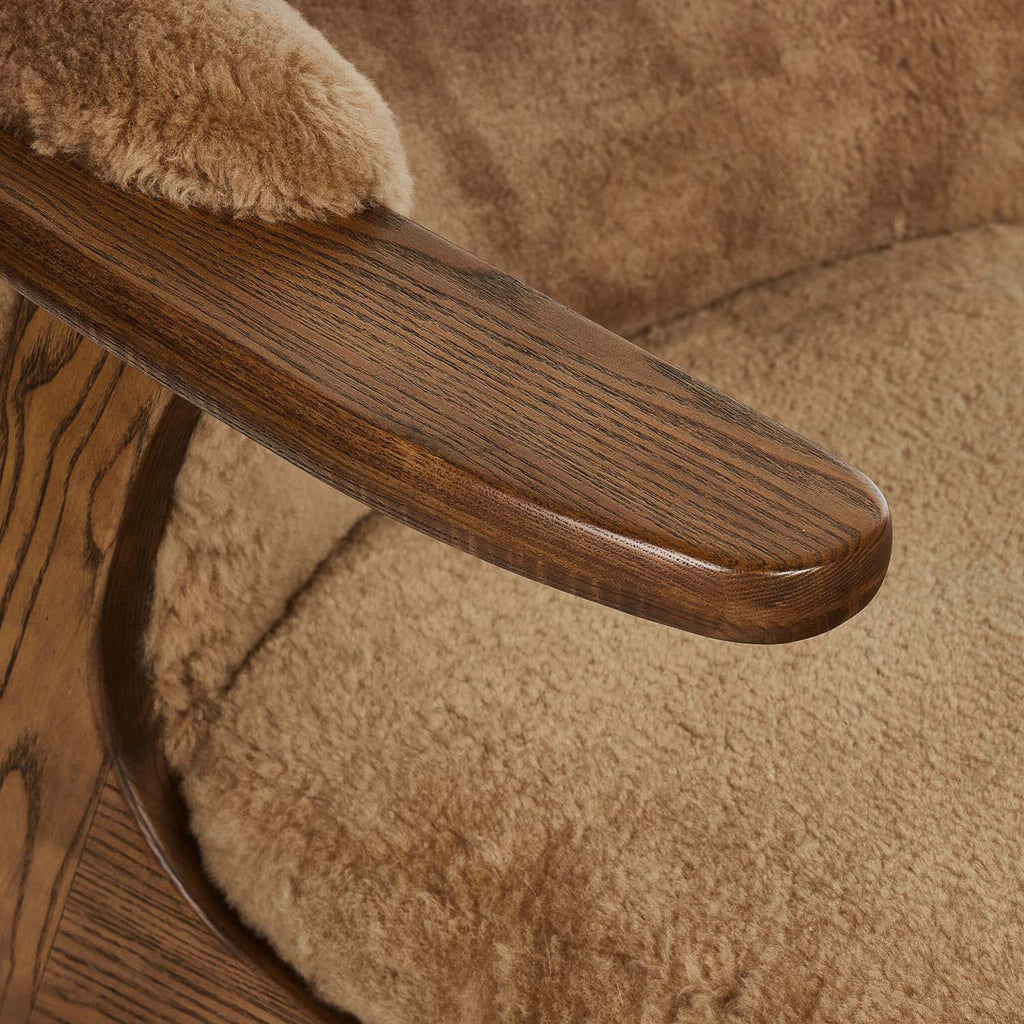 Subtle paddle arms and a wrap frame of amber-finished ash embrace soft brown shearling, while S-spring construction ensures exceptional comfort.