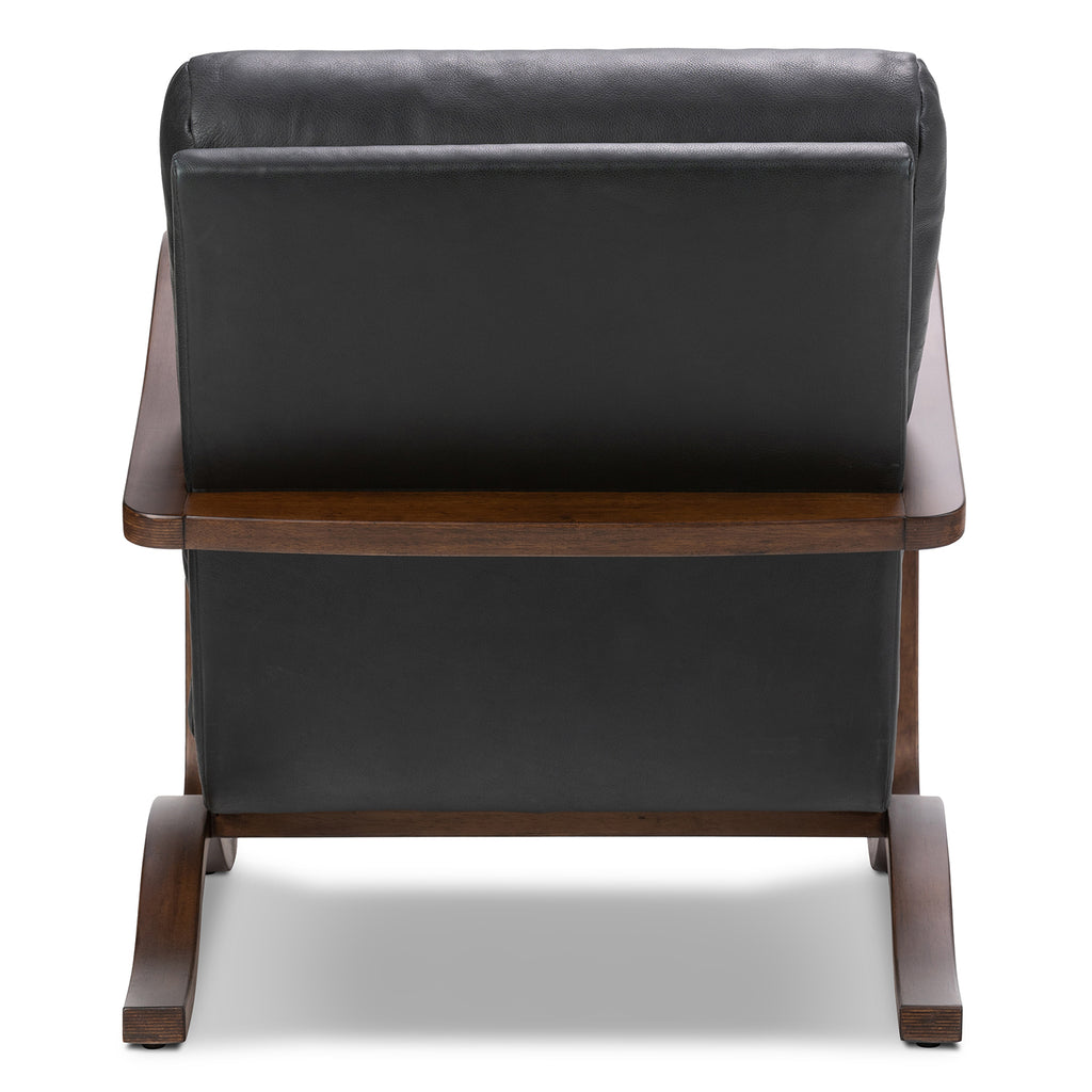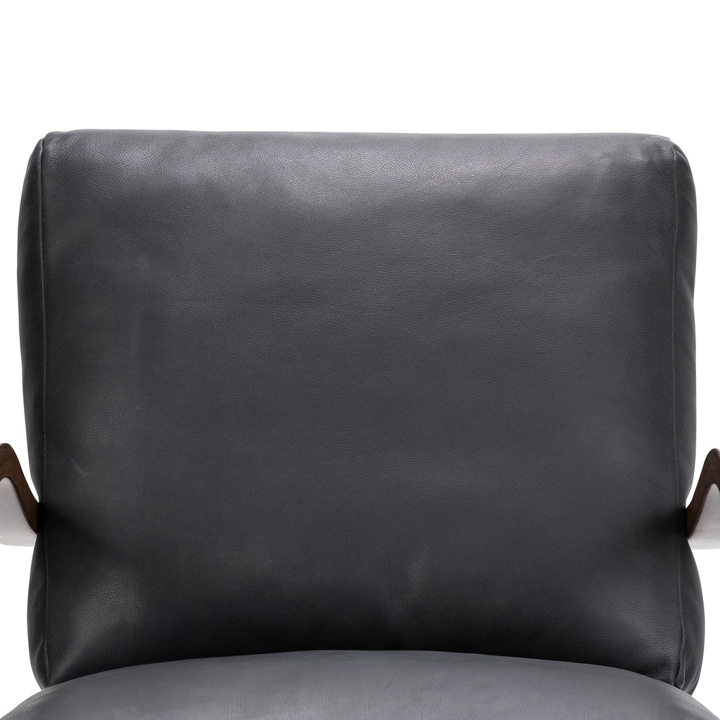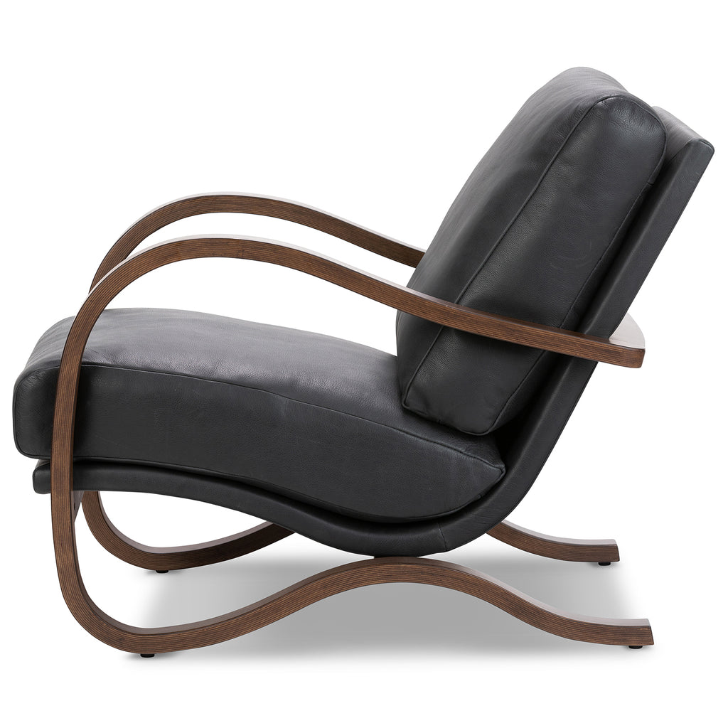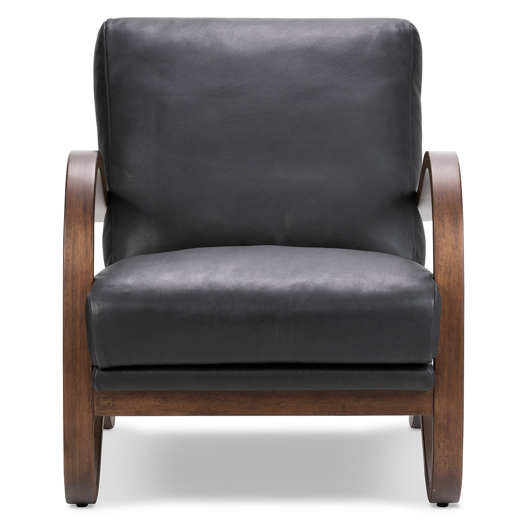 Inspired by vintage rocking chairs, the whimsical frame of this accent chair hugs removable plush feather foam-blend cushions on a webbed suspension style construction for true sink-in comfort. Cushions are upholstered in a supple Brazilian-made leather with a rich grain structure throughout for added character.