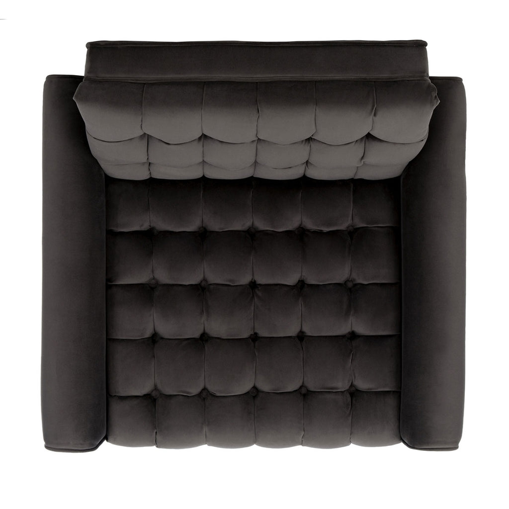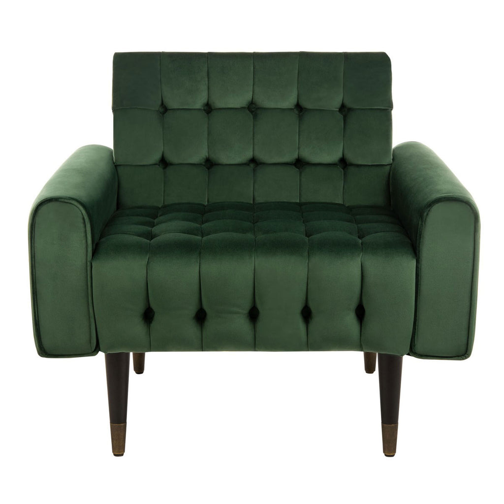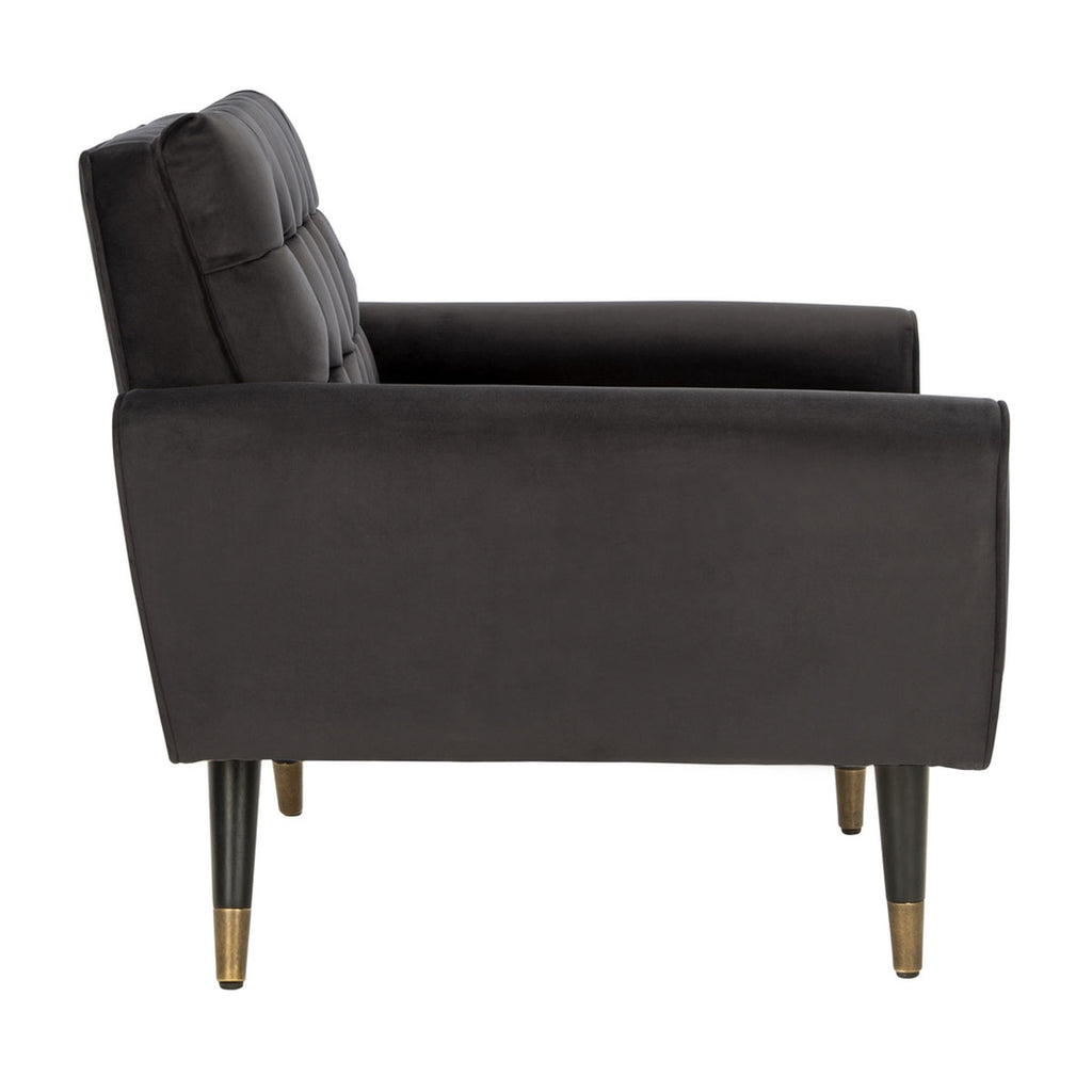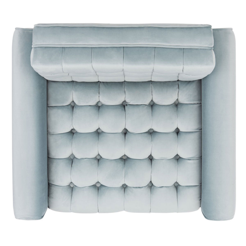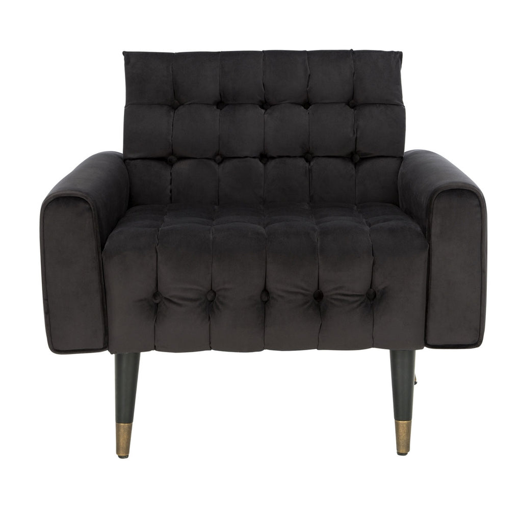 This retro spin on the tufted accent chair updates any contemporary living room. Inspired by optimistic mid-century style, its mod design features generously filled slate blue tufted velvet upholstery and vintage-style black wood legs with brass caps.