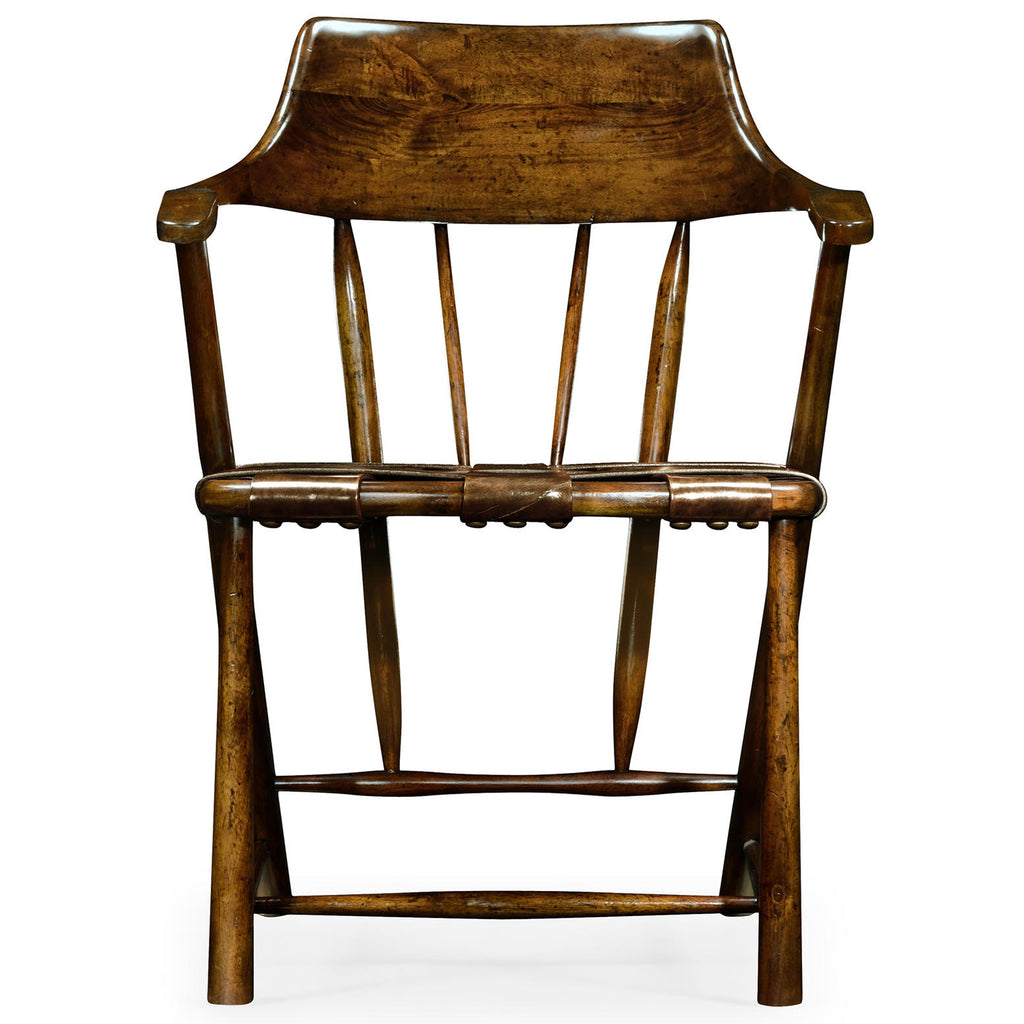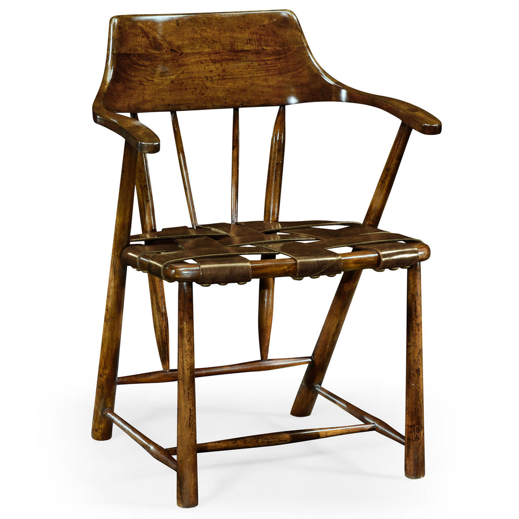 Walnut smokers style armchair with a shaped solid plank back supported on spindle uprights two of which join the stretcher beneath for strength. High arms around a webbed antique chestnut medium leather slung seat, the back regs rising to form the arm supports. Based on a design of c.1860.