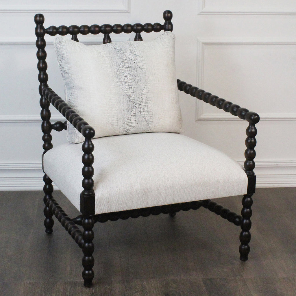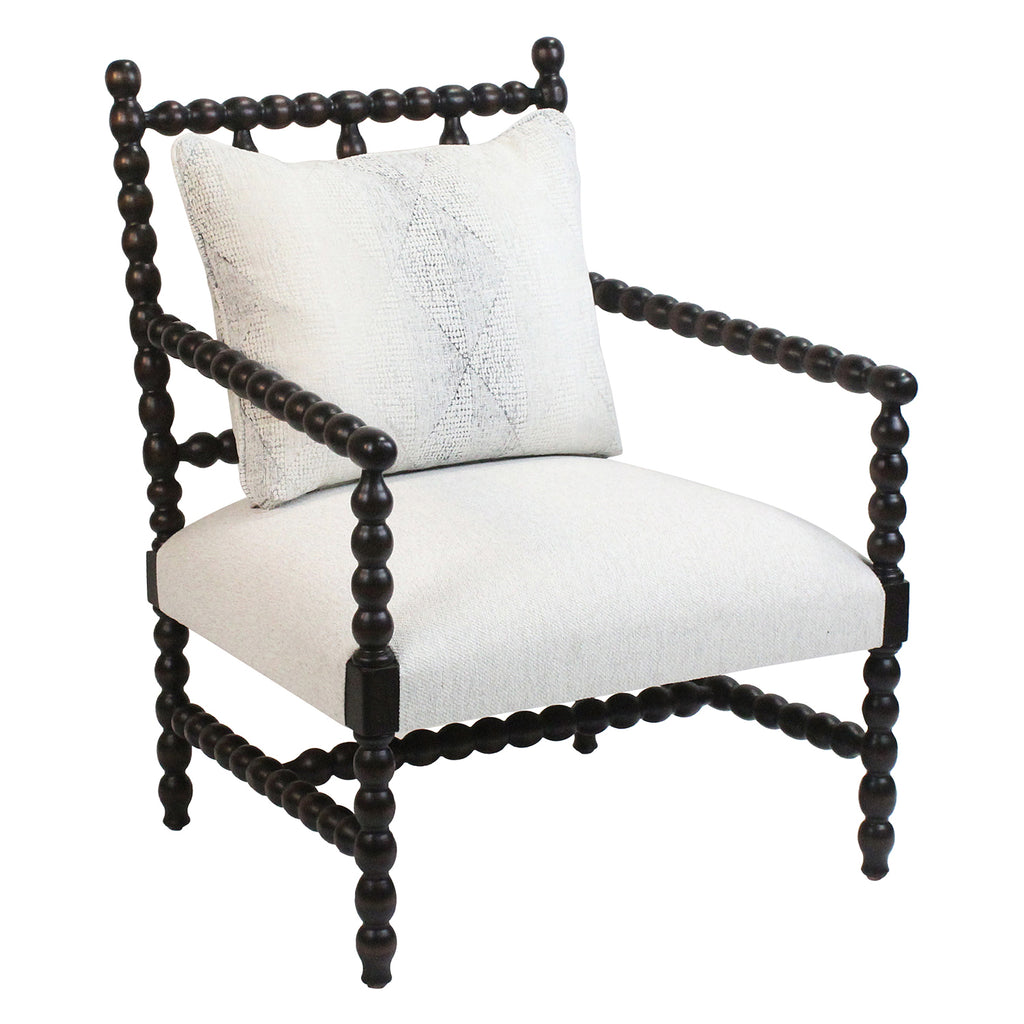 The Occasional Chair Rhodes has exposed wood frame that is hand turned and rubbed in espresso with maple highlights. It is accented by slightly textured solid textile and a loose back pillow in a diamond shape pattern.