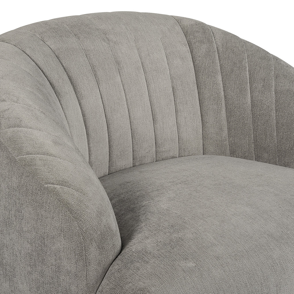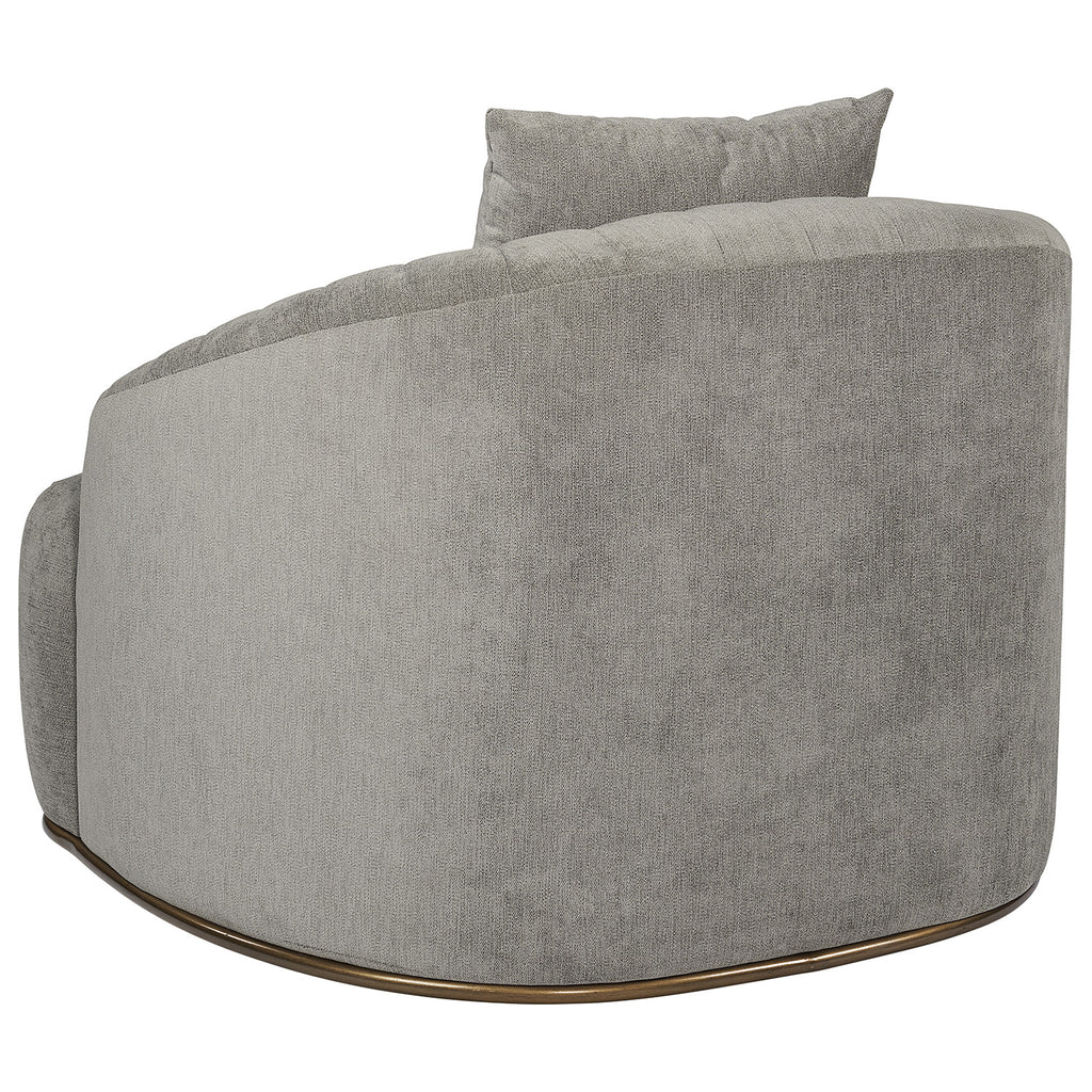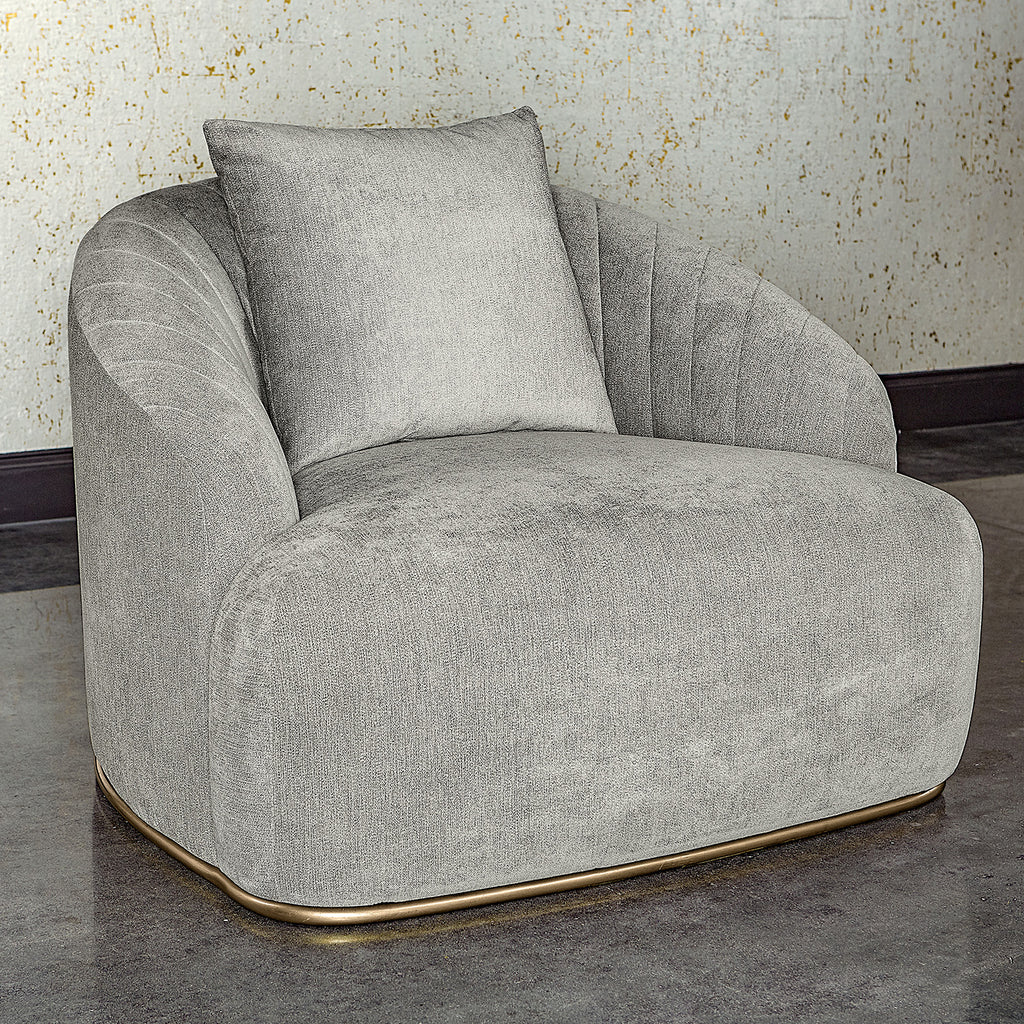 The beautiful lines of this chair will make a bold and comfortable statement in any space. Features a curved seat back with channel tufting in velvet fabric. Finished with an antique brass iron frame.