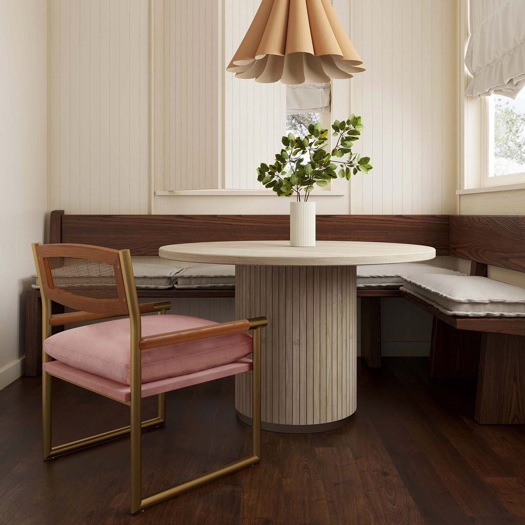 The Harlow chair has a classic mid-century design with a stylish twist. This piece boasts clean lines and warm wooden tones. Featuring rattan details and a gold stainless steel frame, the versatile Harlow will make the perfect head chair at any dining table or be used as an accent chair in your living room!
