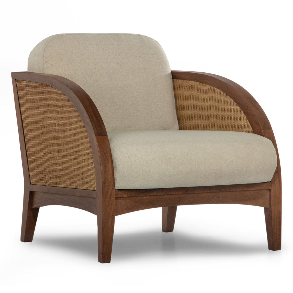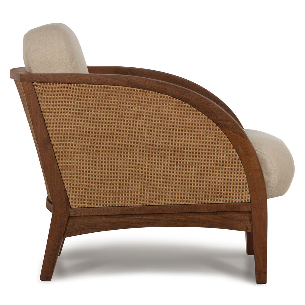 Inspired by coastal living, the Union Home Francisco lounge chair features a solid Acacia frame with woven rattan inserts and natural linen upholstered seat and back cushions.