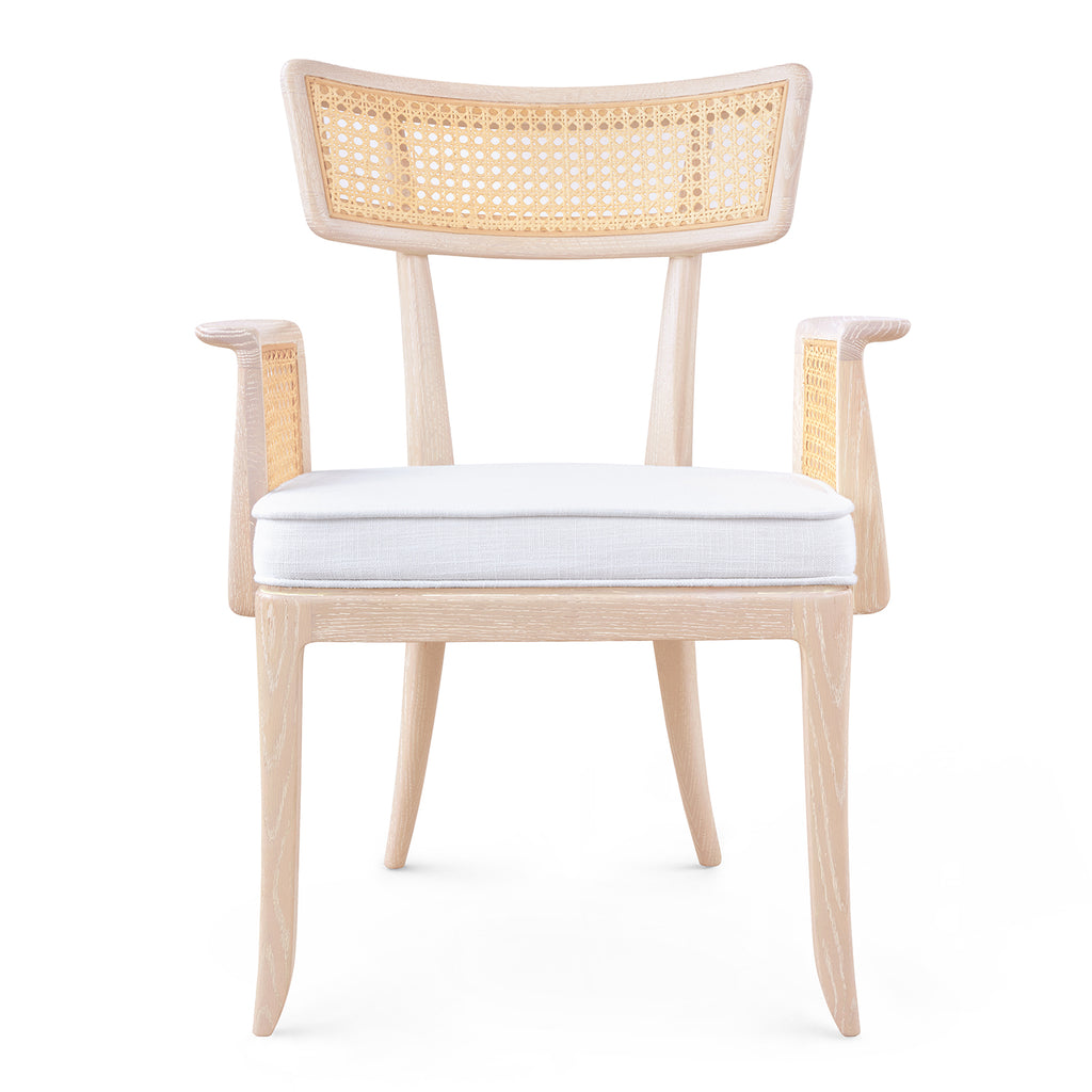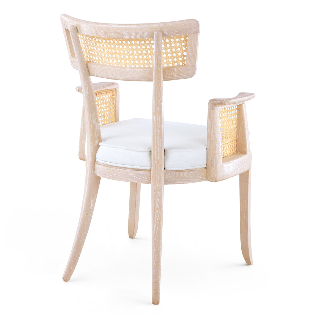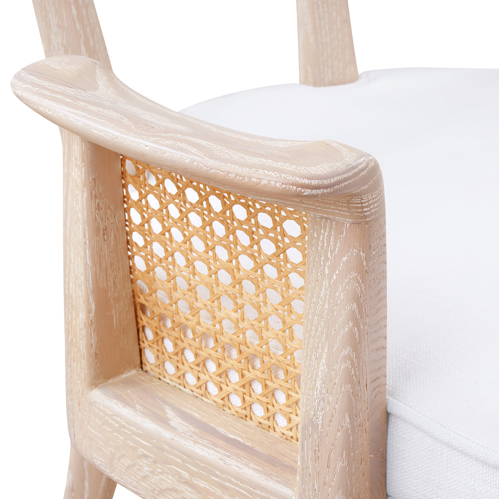 The Marshall Chair Collection is a wonderfully avant-garde addition to our seating selection. With a slight nod to the Art Deco period of the late 1930s, this piece is crafted from solid wood and bleached octagonal cane. The back is slightly curved, and the arms are hand-carved for ergonomic comfort. The seat is fitted with a welted natural linen cushion. The Marshall Armchair is a standout addition to any dining room, office, or den.