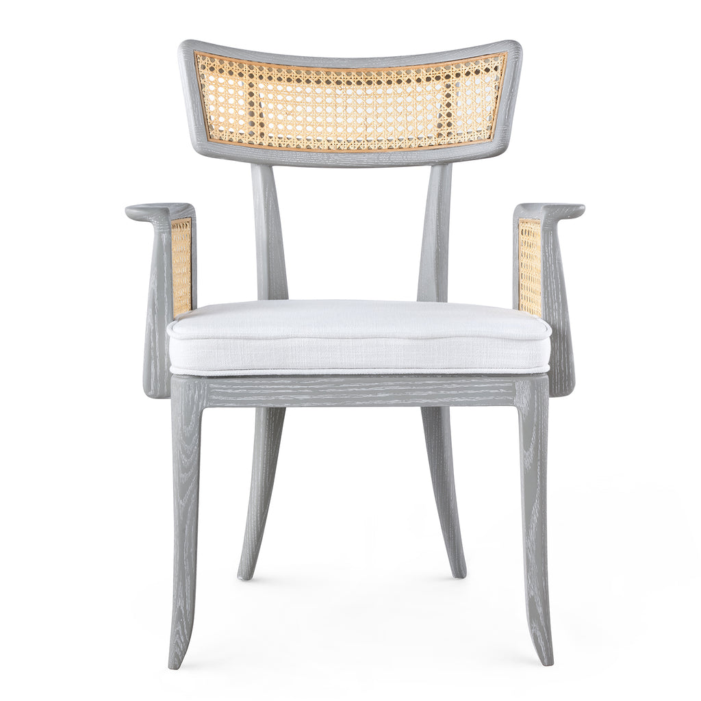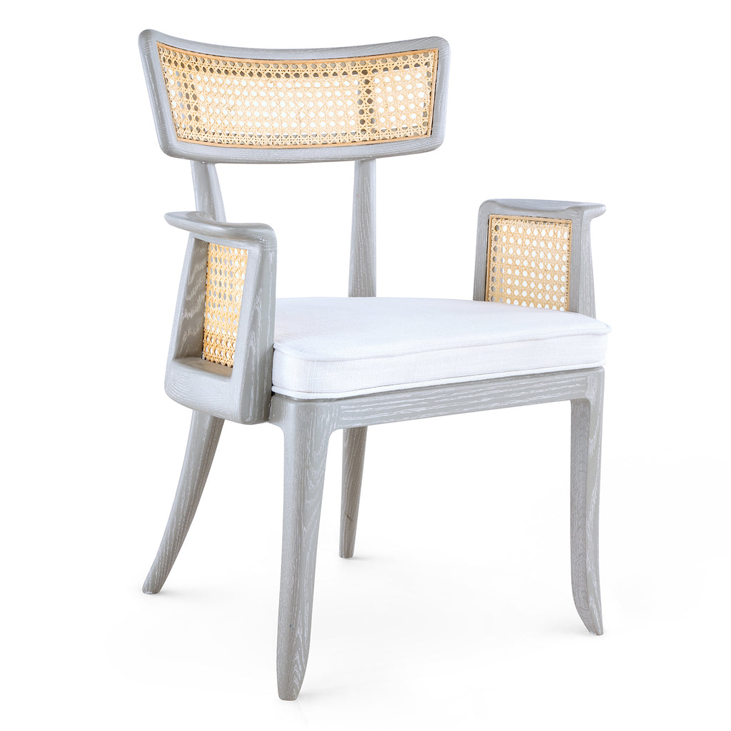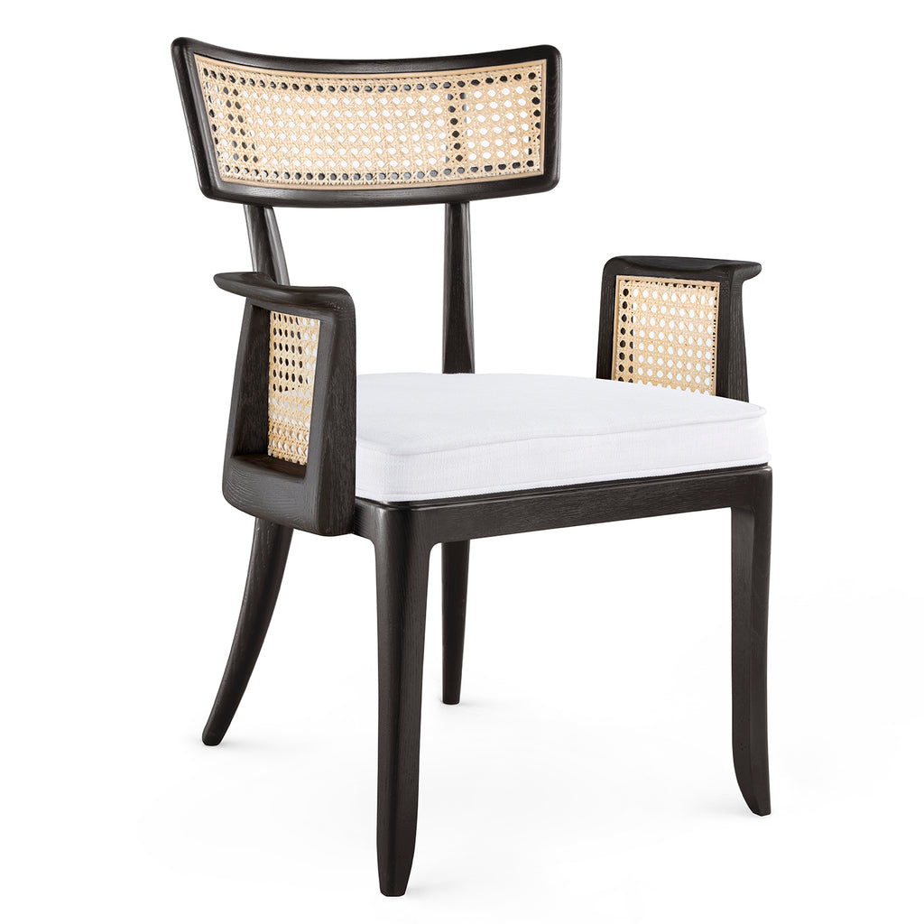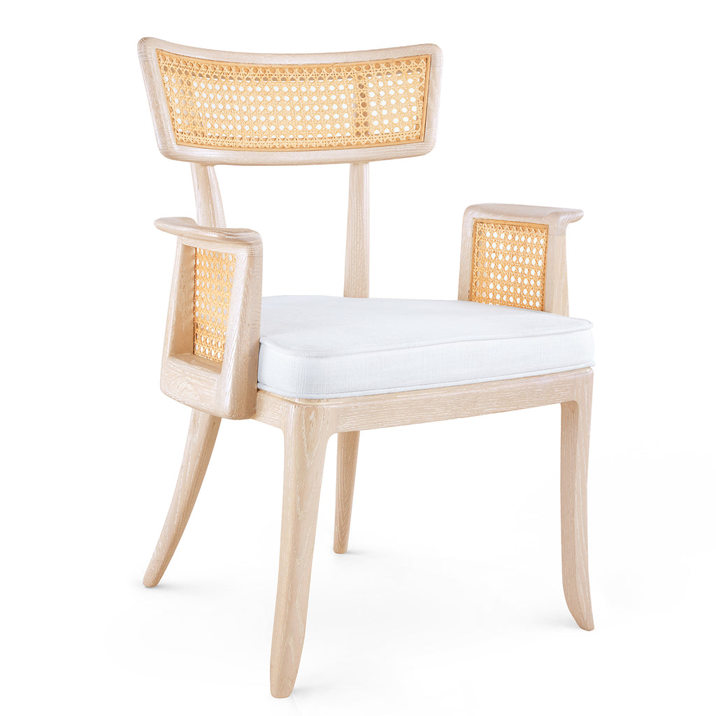 The Marshall Chair Collection is a wonderfully avant-garde addition to our seating selection. With a slight nod to the Art Deco period of the late 1930s, this piece is crafted from solid wood and bleached octagonal cane. The back is slightly curved, and the arms are hand-carved for ergonomic comfort. The seat is fitted with a welted natural linen cushion. The Marshall Armchair is a standout addition to any dining room, office, or den.