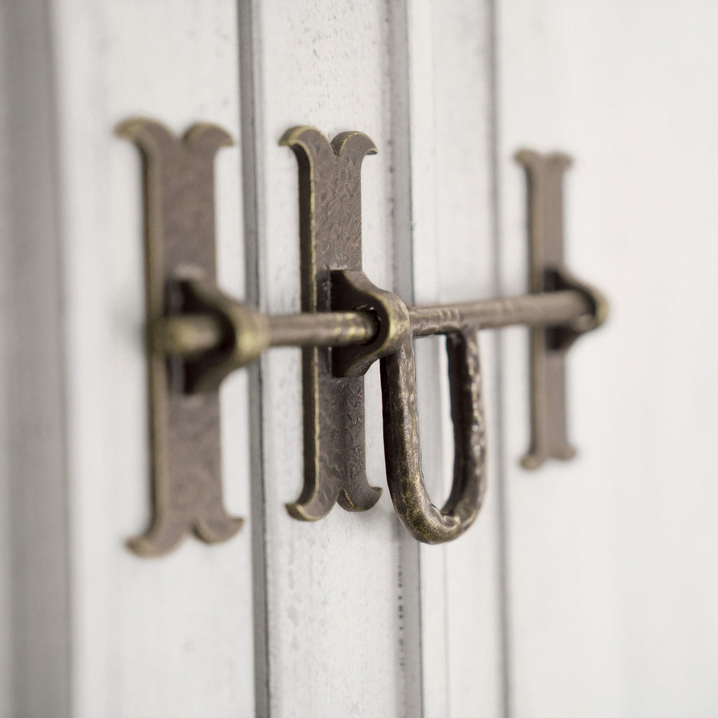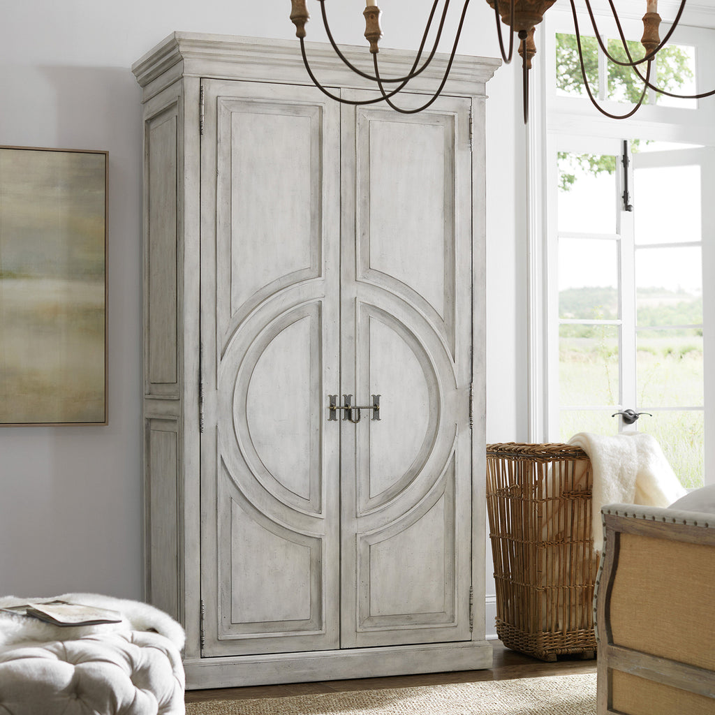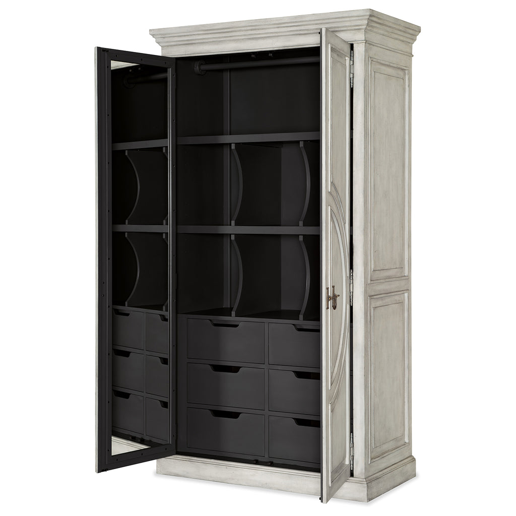 Exuding a sense of balance and serenity, the stylish focal point Bilzen Wardrobe has a stunning circle motif at the center. Design details include raised panel doors and distinctive latch-key hardware. The piece features a Whitewash finish with a beautiful Merion Blue interior. two full length doors is a full length mirror on the back of the left door and six drawers, two adjustable wood shelves, four removable dividers and a clothing rod.