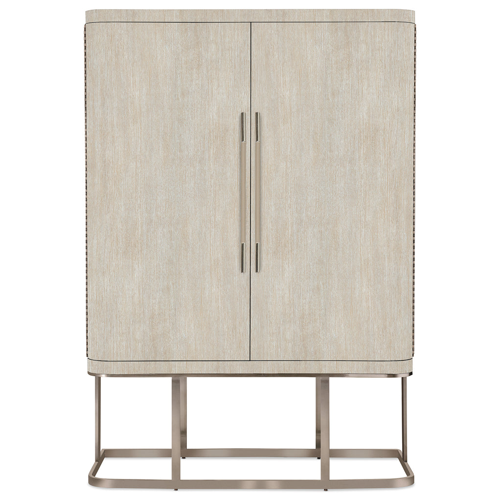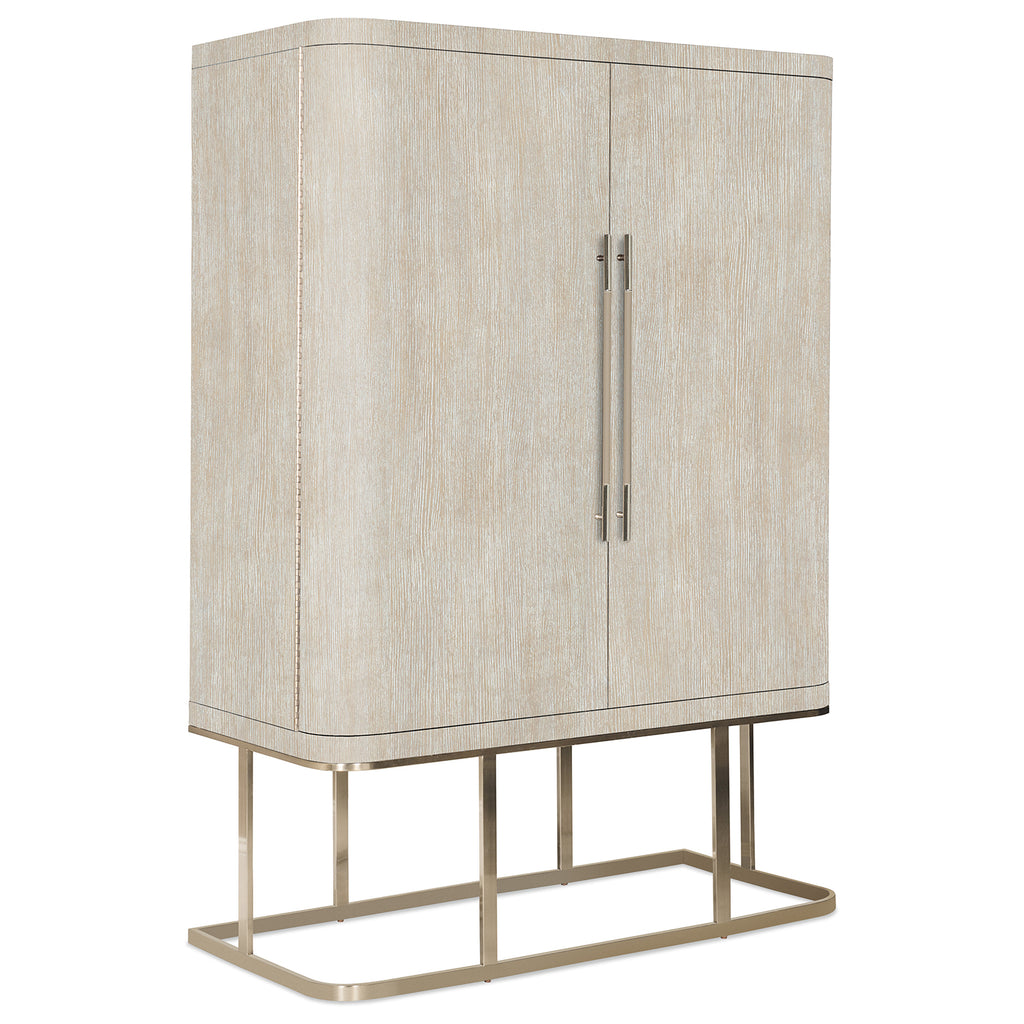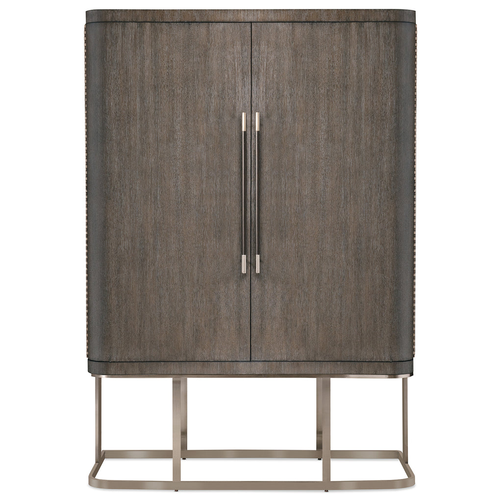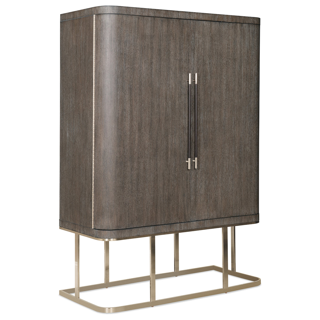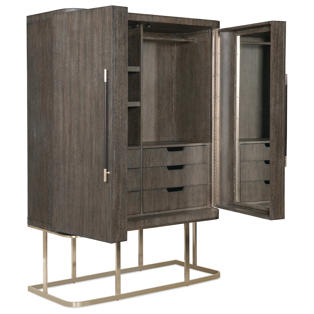 Architectural and timeless with a luxe mixture of materials, the Modern Mood Wardrobe is a statement piece. The shaped metal base gives the cabinet a floating appearance. Crafted with Oak Veneers, the wardrobe has two large wood doors with piano hinges and mirror glass on the back of the right-side door. Behind the right-side doors are two adjustable shelves. Features include six self-closing drawers, a removable clothing rod and jewelry storage behind the left-side doors that includes 26 hooks, three felt-lined trays and one removable drop-in jewelry tray with four padded rows for rings.