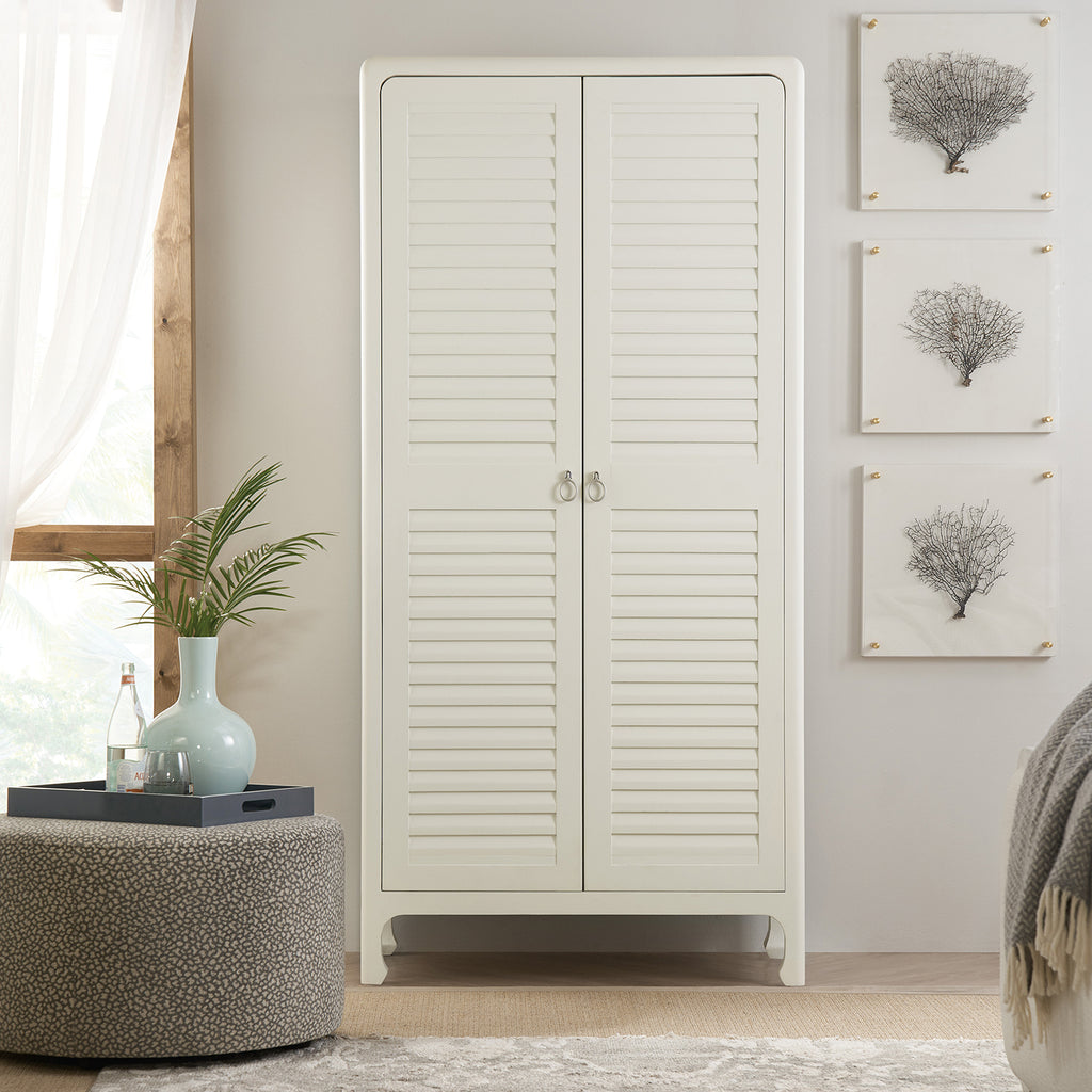 Inspired by casual waterfront living, the Cape May Wardrobe has two louvred doors with soft-close hinges. Crafted of Maple Veneers, the wardrobe is finished in the soft textured sandblasted white Shell color with light champagne ring pulls. Behind the louvred doors are soft-close drawer guides, three adjustable shelves and a removable clothing rod.