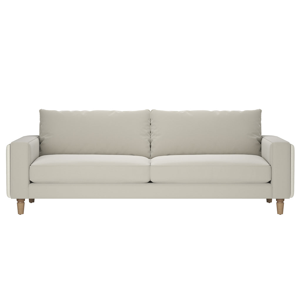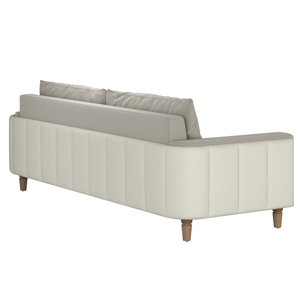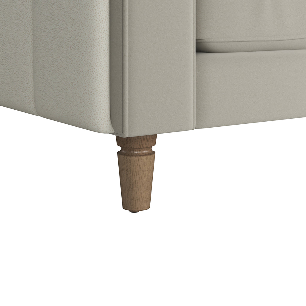 A modern masterpiece, this design features wide, channeled detailing that contrasts beautifully with the sumptuous softness of sand-colored velvet. The sleek track arms enhance the elegance, bringing a refined simplicity to this luxurious piece. It?s a stunning blend of texture and color, creating an inviting haven of sophistication and style.