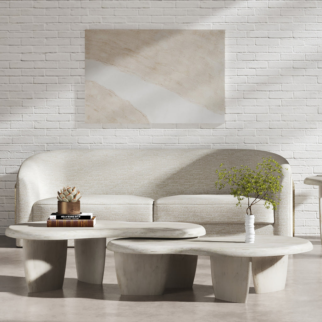Evoking an open air and near the sea allure, Ashlar blends Coquina textures and silky-smooth painted surfaces into organic silhouettes. Its neutral color palette and sanded metal accents are reminiscent of a stroll on the sparkling sands of the Keys. Amorphic shapes mix with rich textures to stir a sensory experience that satisfies any space with a relaxing and calming ambiance. Shown with the Ashlar Low cocktail table, available separately.