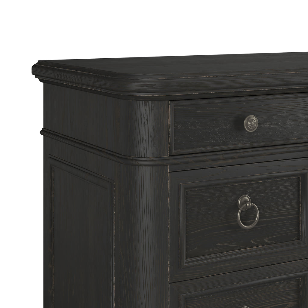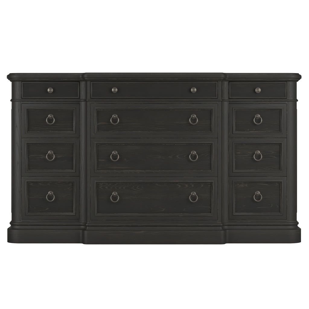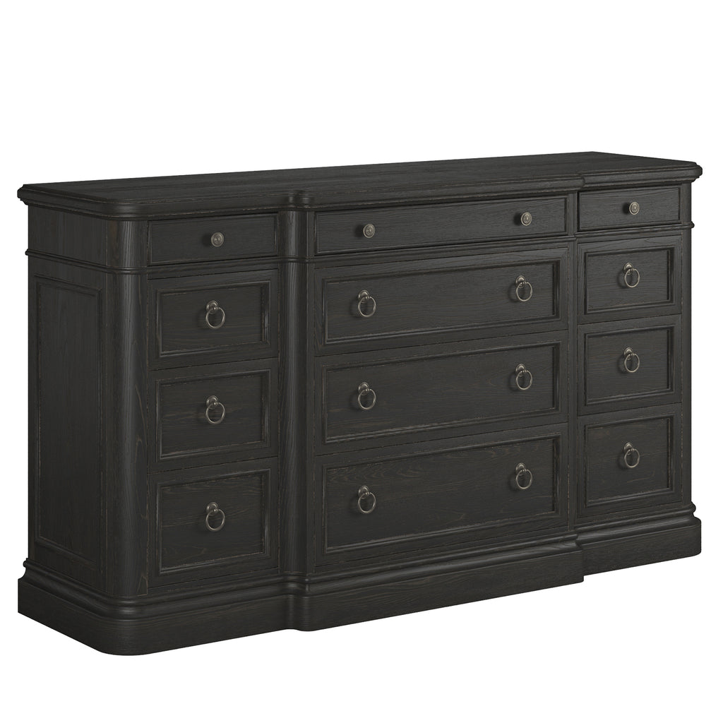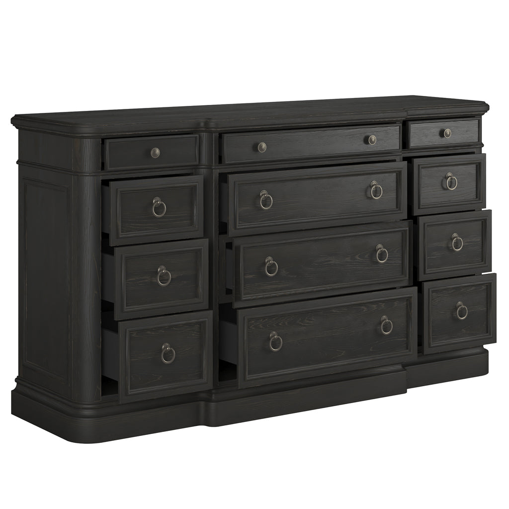 Classical style meets practical storage in the Atrium Dresser, featuring twelve ample drawers with lower drawers lined in aromatic cedar, guaranteed to hold four seasons' worth of wardrobe options. Paised panels and inset columns highlight a deep blackened finish and oil rubbed bronze hardware in a balanced style that is equal parts historic and contemporary.