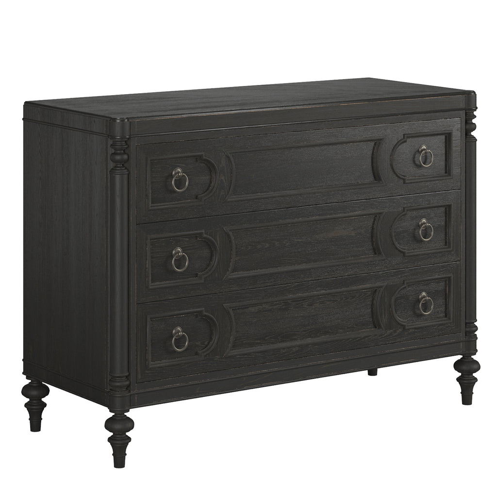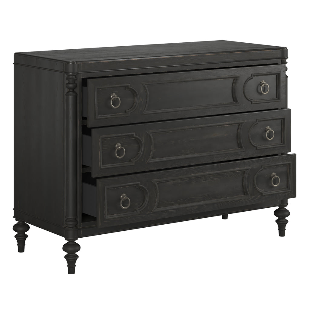 Beautifully constructed with blackened sable hand glazed finish, the three drawer Atrium Bachelor's Chest offers more than just ample storage space, it's an eye-catching combination contemporized classic style and historical elegance. Featuring traditional raised paneling with beautiful curved accent molding detail, each drawer is finished with oil rubbed bronze ring pulls.
