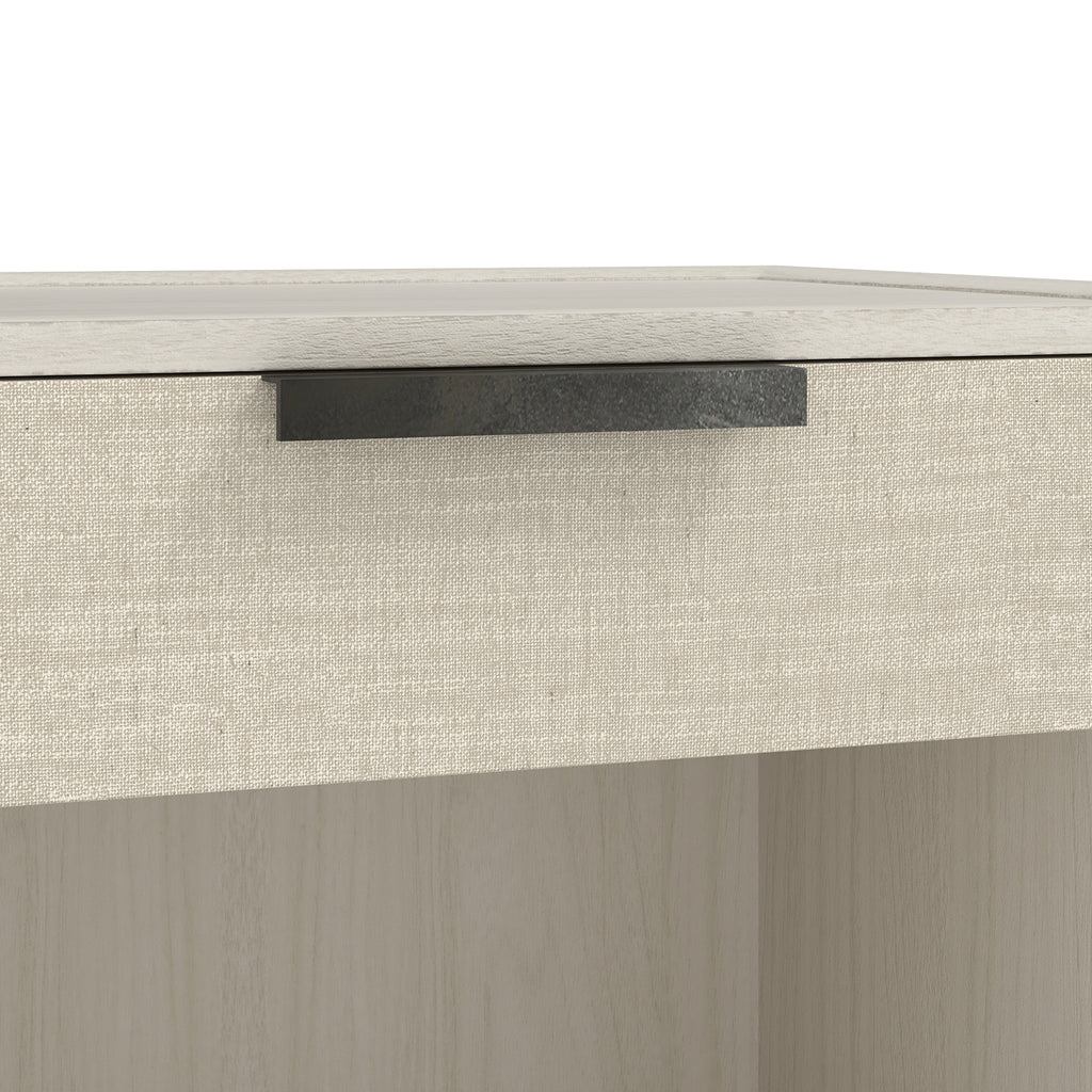 • Drawer-fronts wrapped in a linen-blend fabric with a performance treatment