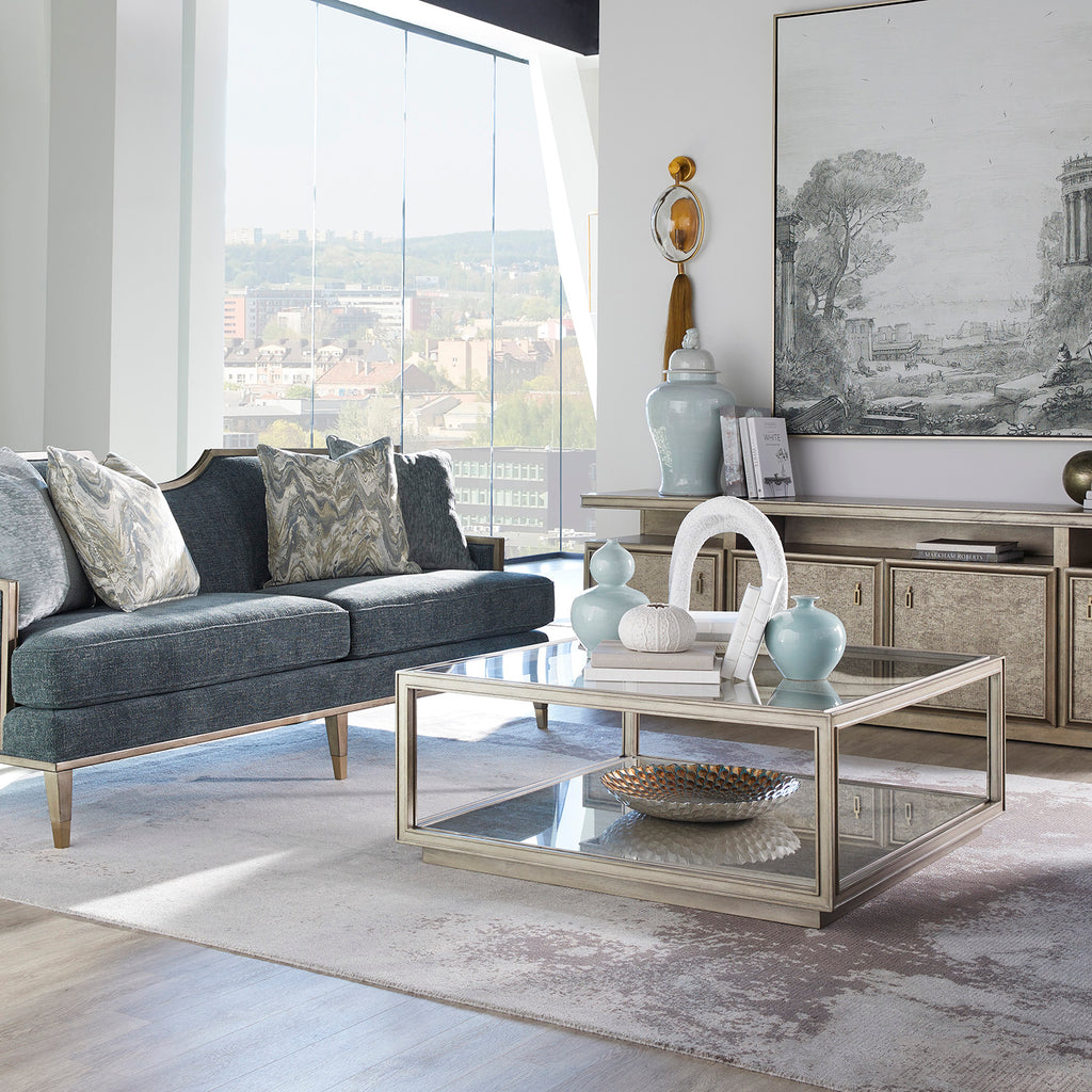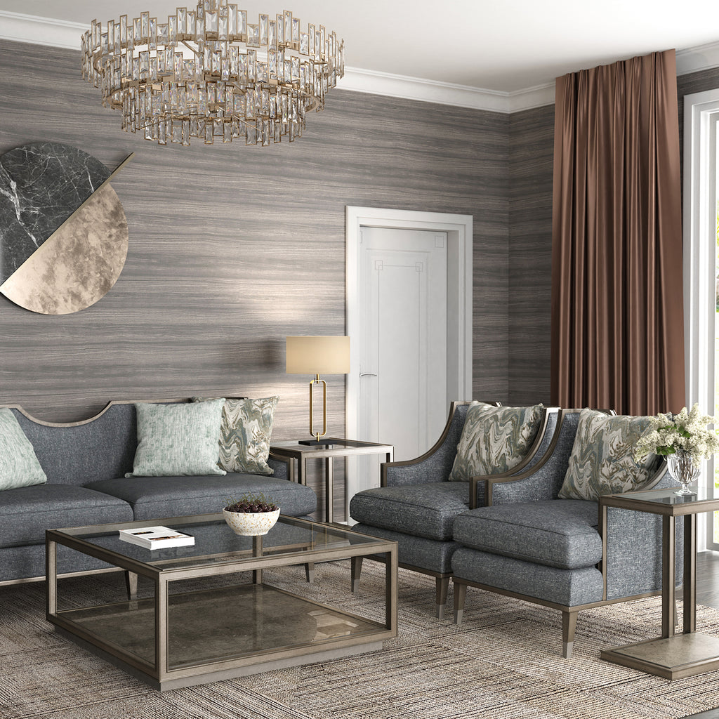 • Exposed wood frame in a Mica finish features concave back rail