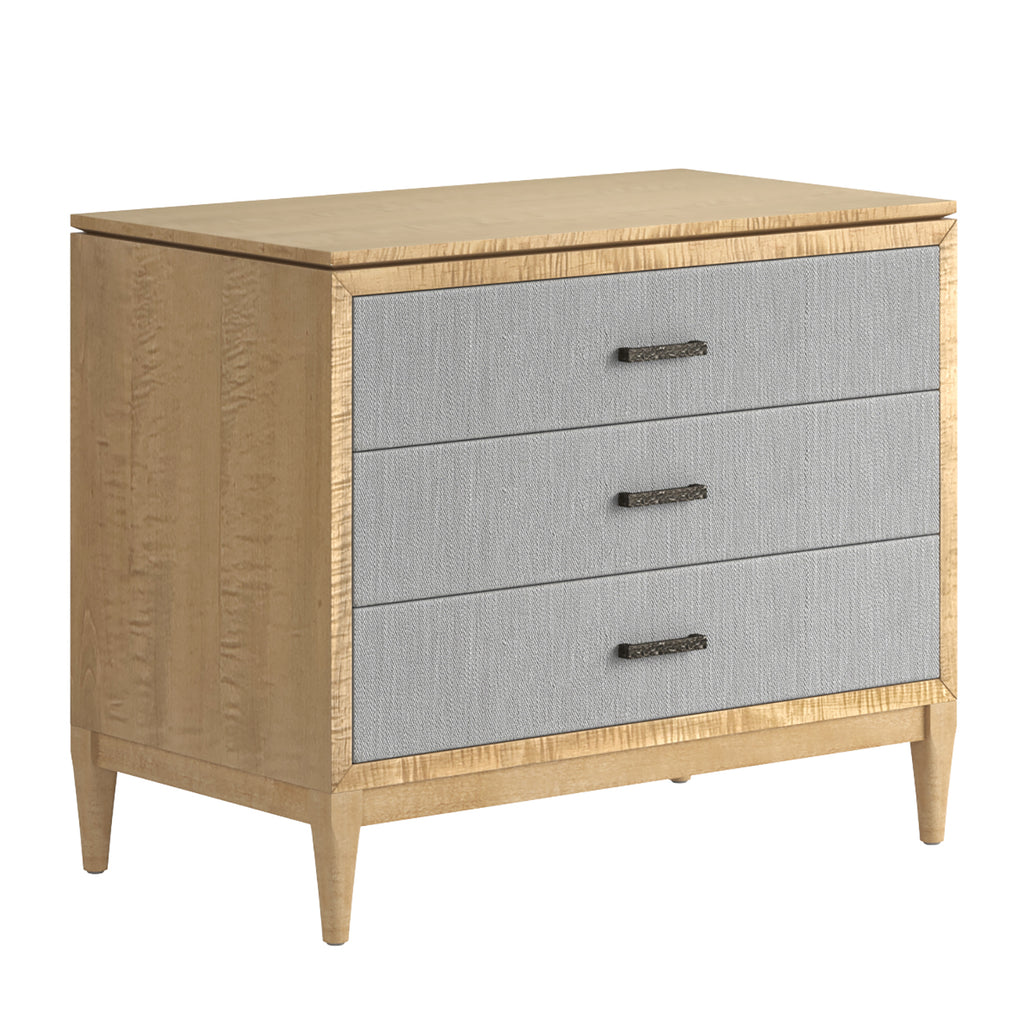 Classic contemporary 3 Drawer Bedside Chest in Figured Maple, Textured Gray Fabric