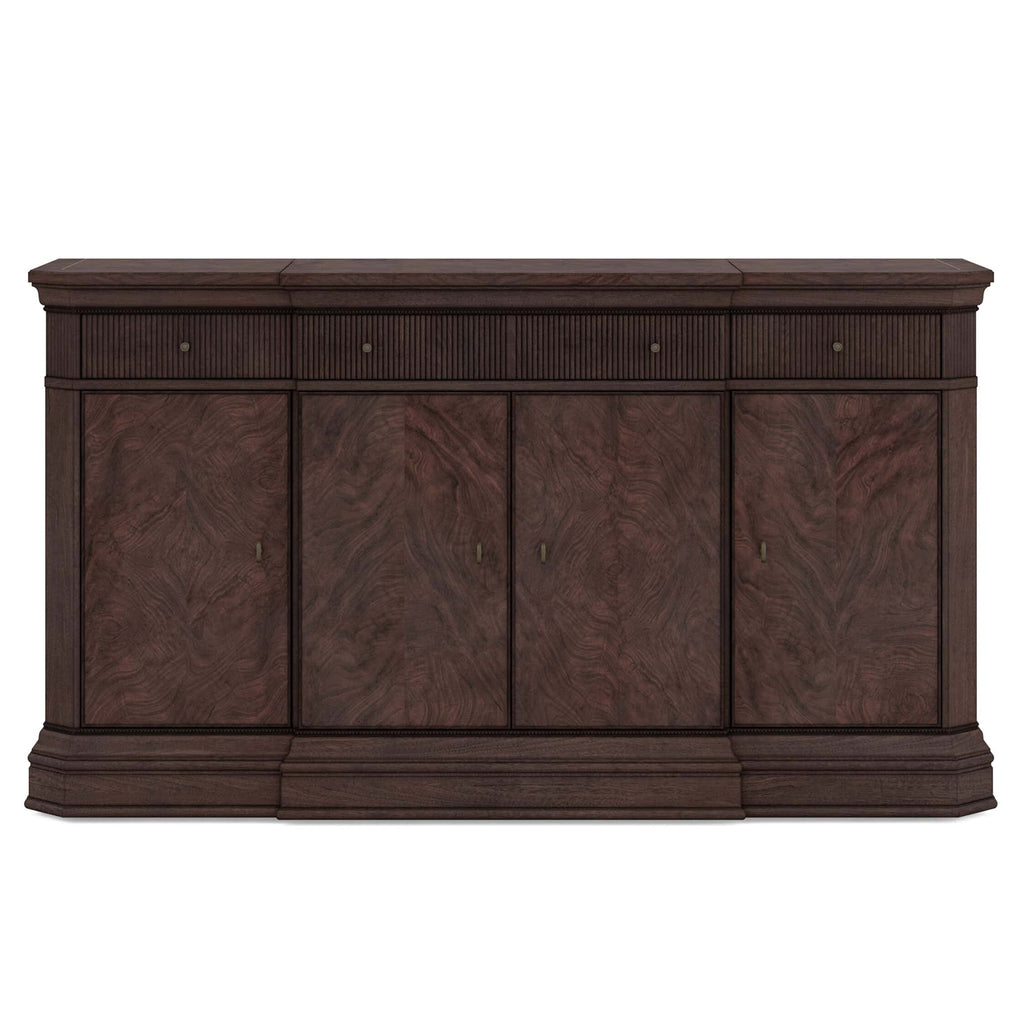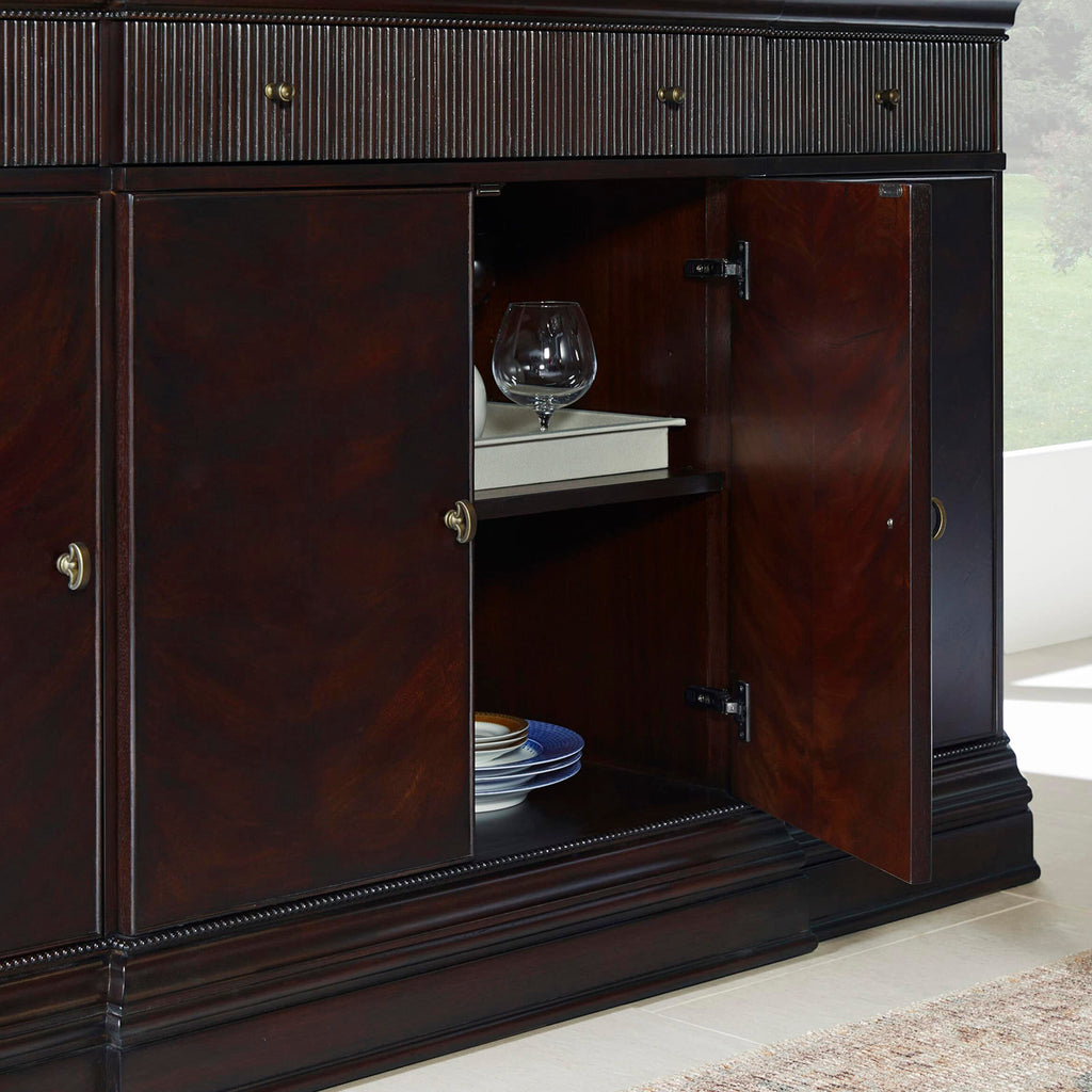 Crafted with meticulous attention to detail, this credenza is designed to elevate your home décor while providing ample storage and functionality. Featuring the staples of our Revival Collection, including a rich mahogany finish, detailed reeding, canted corners and wrap around moldings, this piece makes a lasting impression. Ample storage includes a discreet, felt lined, lift-top compartment and adjustable shelves behind each door for customizable options. With its timeless design and luxurious details, this credenza becomes a statement in any room.