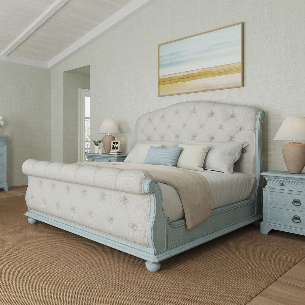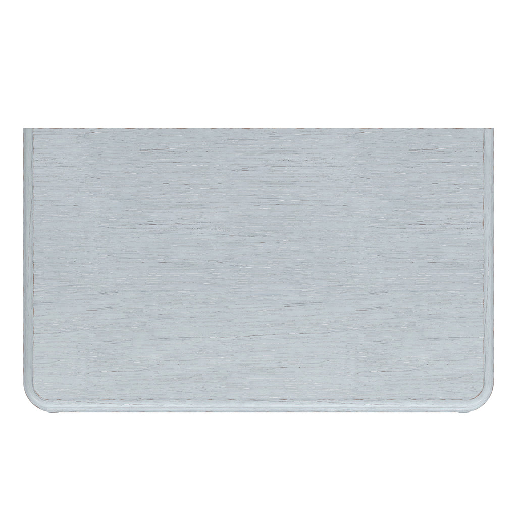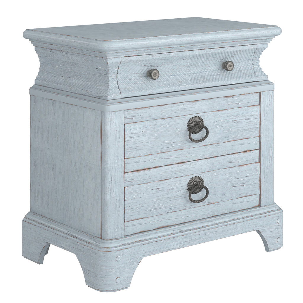 The sturdy little Light Keeper's Bedside Chest has two drawers in its body and a third drawer tucked into the concave upper box banded with chevron carving. Artisanal details include molding around top and base; vintage-inspired drawer pulls rubbed with antique white; and wooden pegs on the bracket feet. The oak chest's distressed blue finish brings out the beauty of the character of a found item.