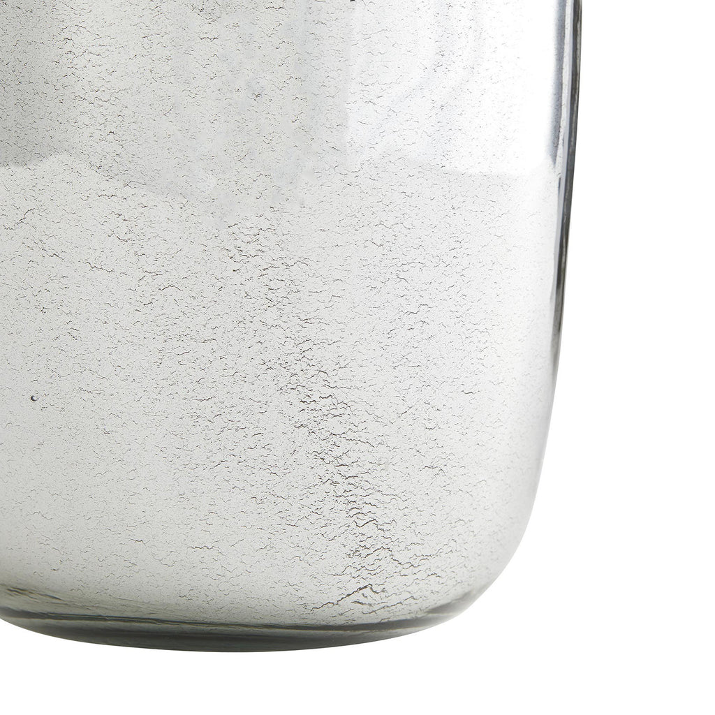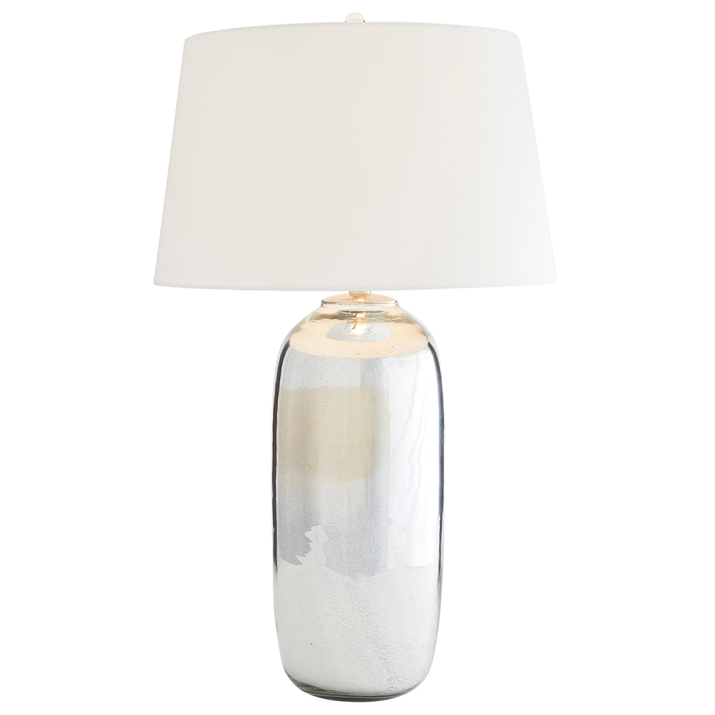 Aged mercury glass finish table lamp is topped with a tapered off-white silk shade with lining to match. 3-way switch.
