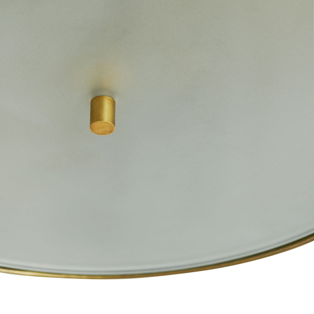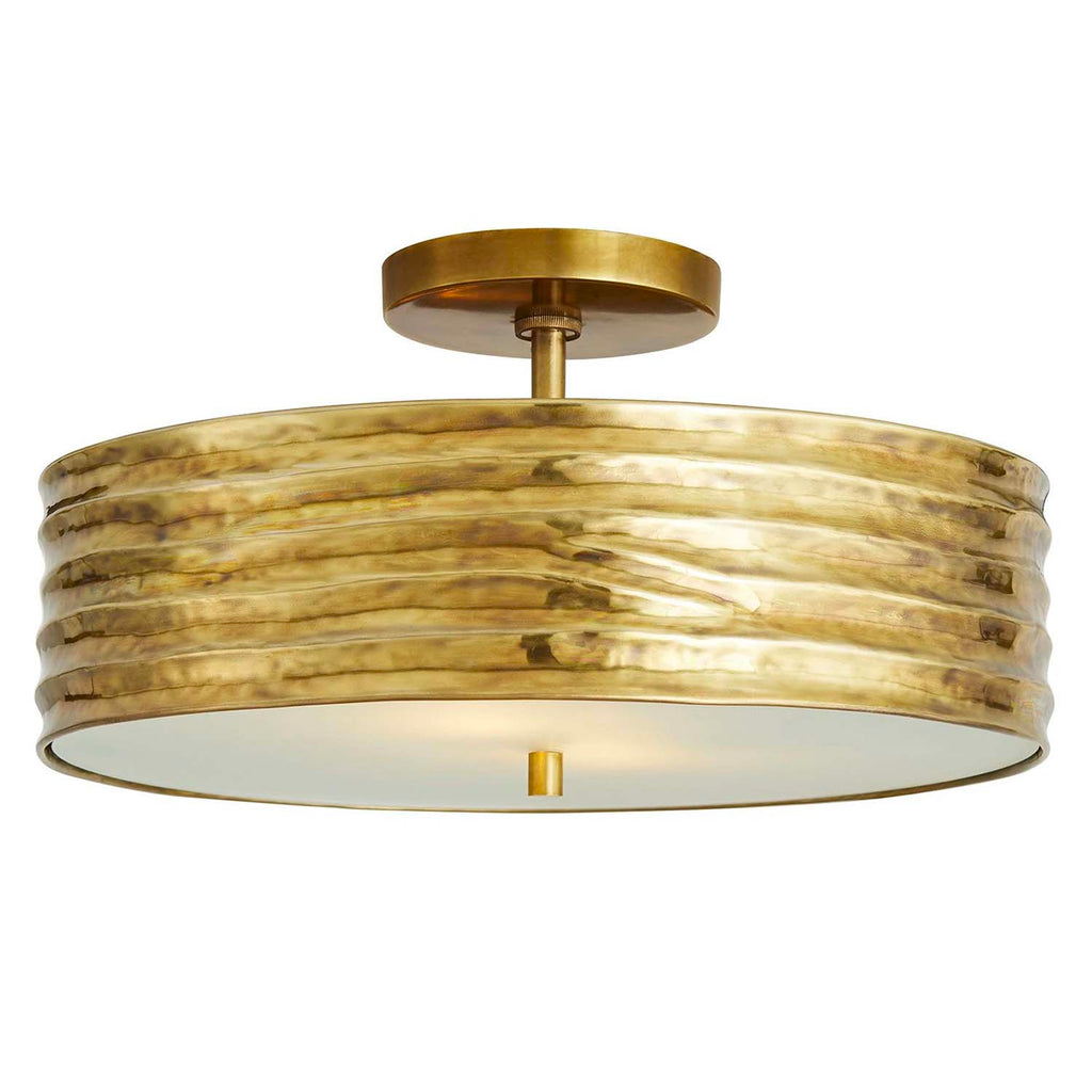 Taking a design tip from the Arteriors archives, this semi-flush mount echoes Hollywood Regency style with its classic form and antique brass finish. The antique brass iron frame features a ribbed relief, adding a textured quality to a space. Hang in pairs for an added dose of glam. Finish will vary. Damp rated, though limited covered outdoor conditions may affect finish.