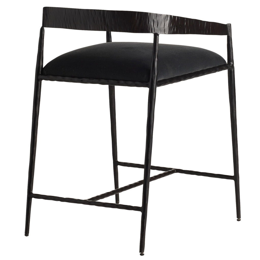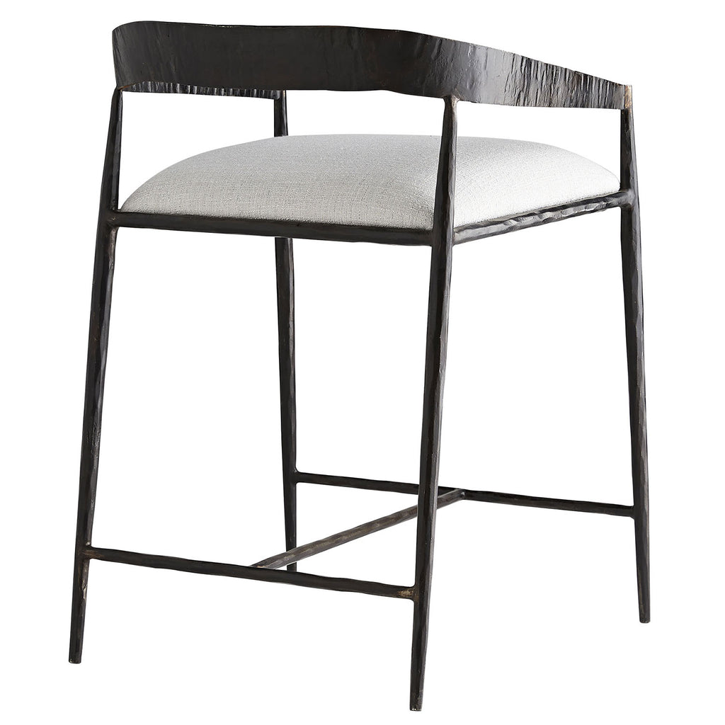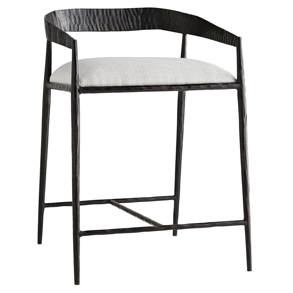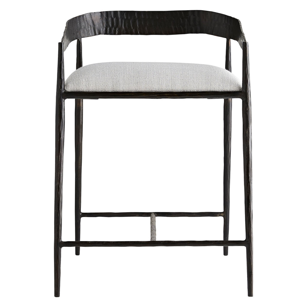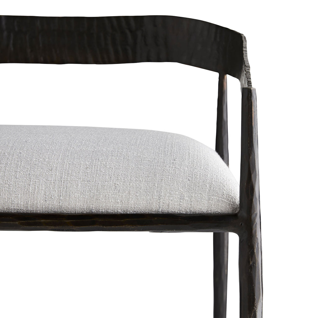 Sharp angles and an unrefined curvature define the bold aesthetic of this stool. Natural iron has been hammered by hand to create the rich impressions seen along the shallow back while the hand-forged legs yield more delicate details. The tight seat is covered in sterling linen elegantly elevating its textured façade. Also available as a bar stool (4747).