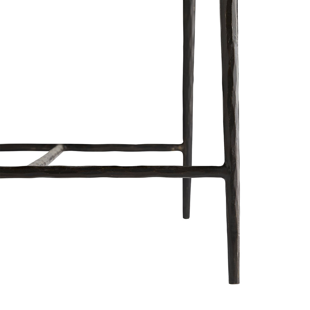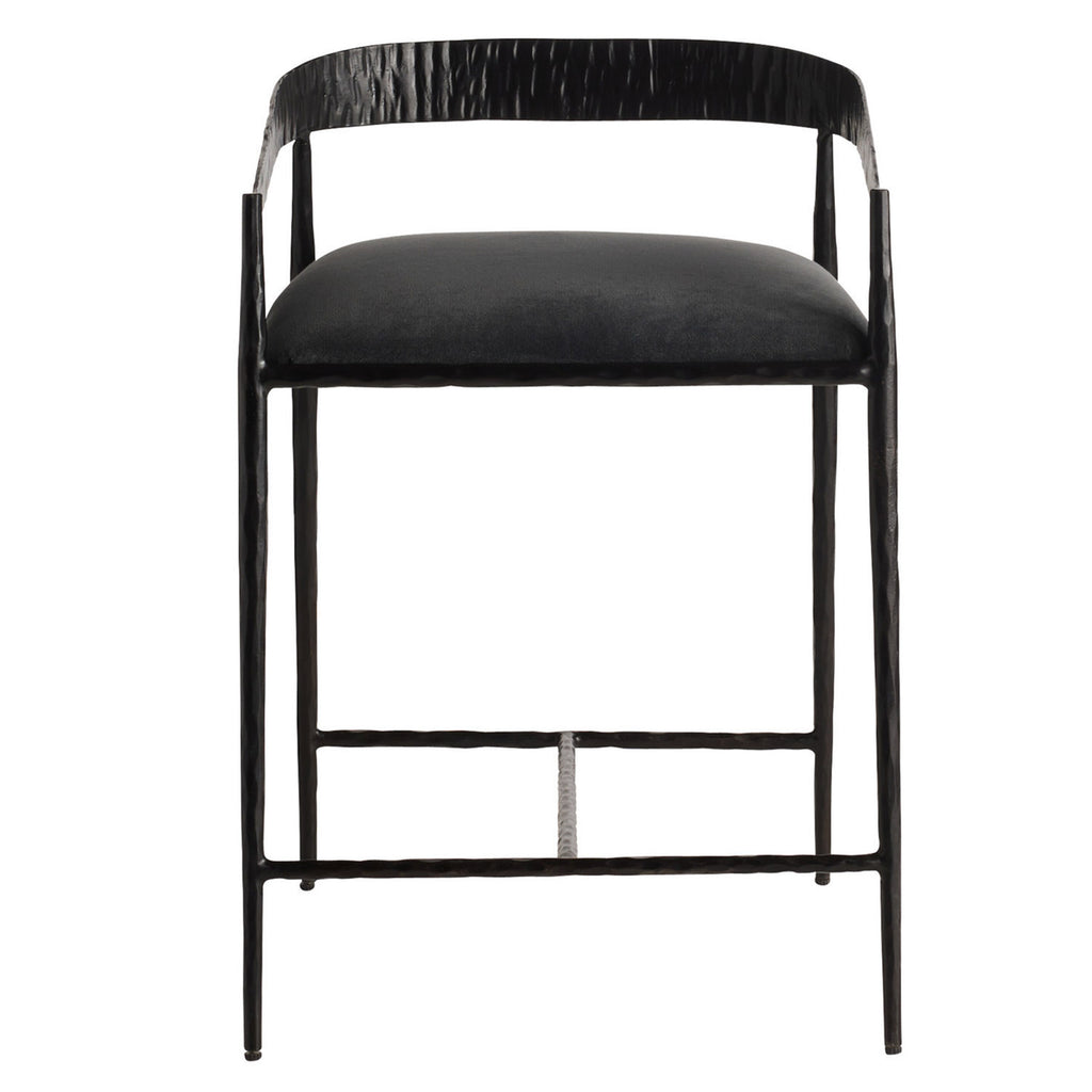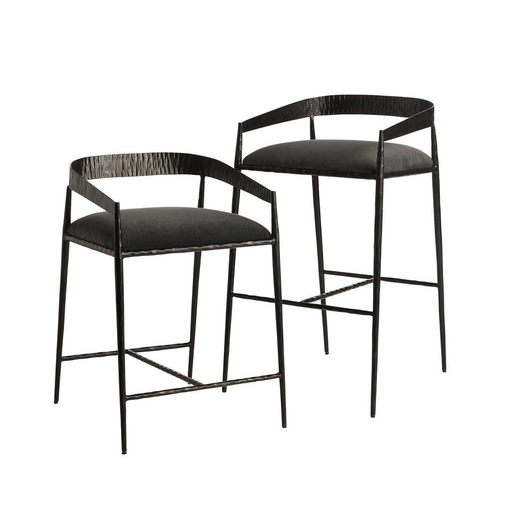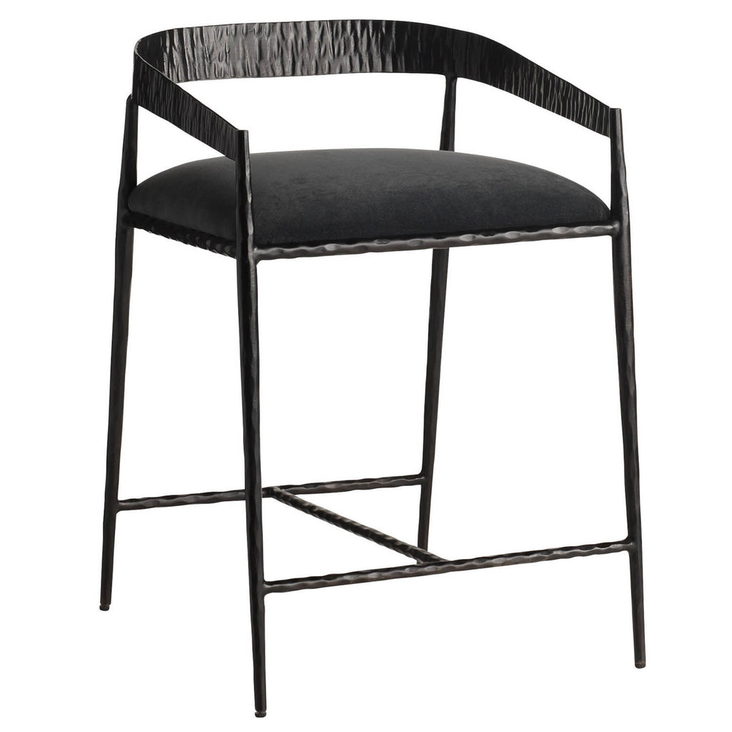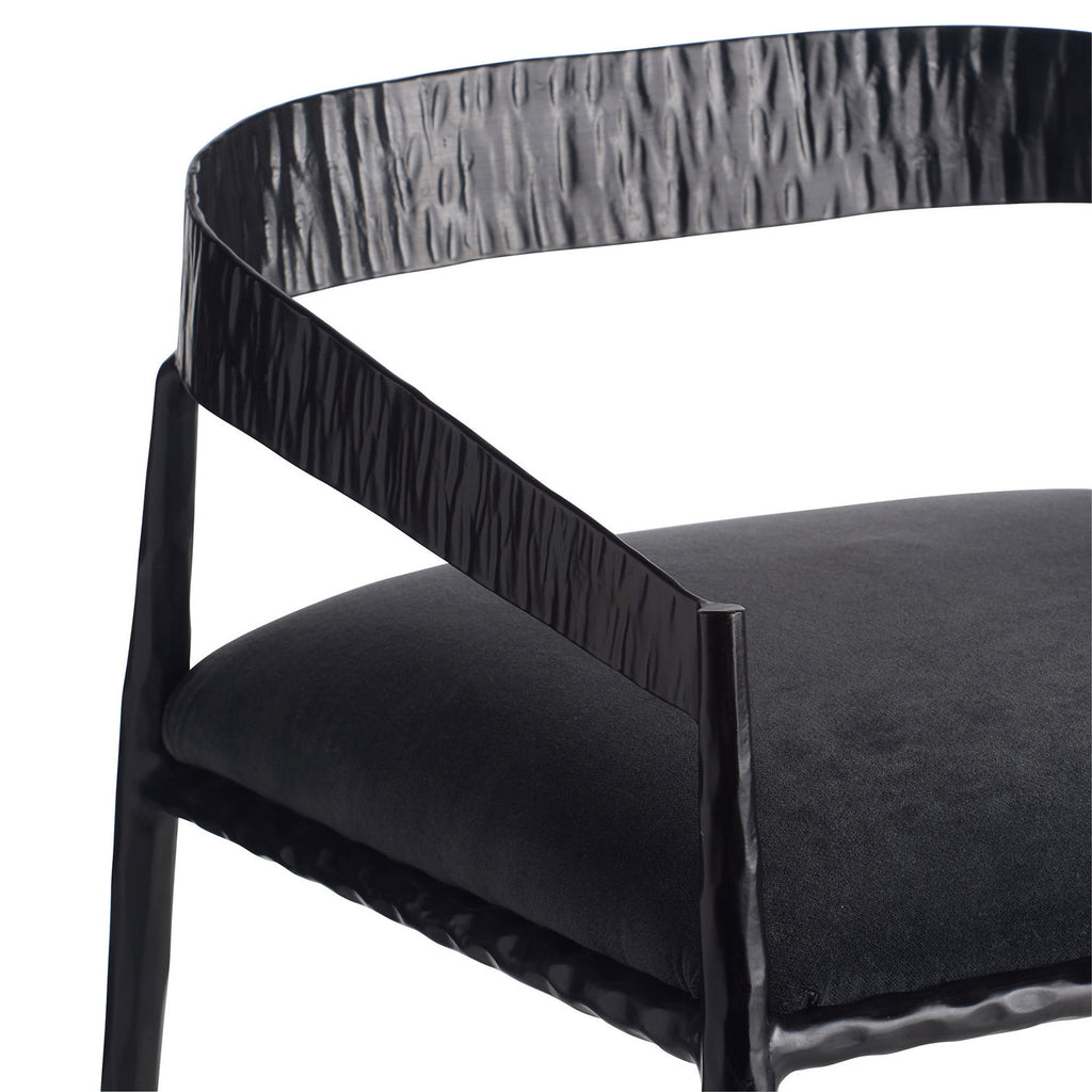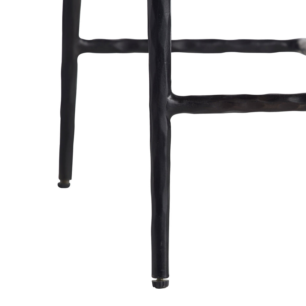 Sharp angles and an unrefined curvature define the bold aesthetic of this stool. Natural iron has been hammered by hand to create the rich impressions seen along the shallow back while the hand-forged legs yield more delicate details. The tight seat is covered in sterling linen elegantly elevating its textured façade. Also available as a bar stool (4747).