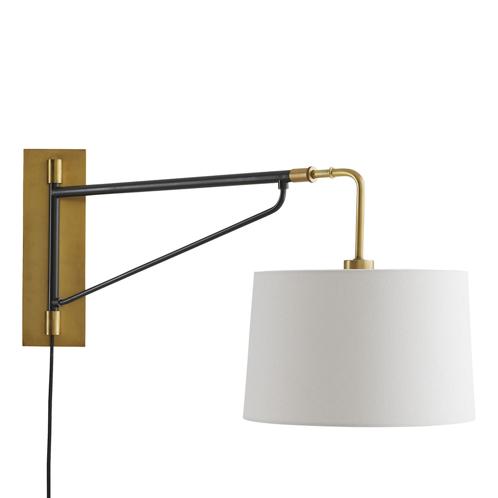 Brighten up your bedside so you can get busy with those books you've been meaning to read—but do it in style. The traditional design of this sconce features an adjustable steel arm that allows you to pivot this piece to your desired direction. A small white linen shade contrasts handsomely with the two-toned hues of the bronze and antique brass finishes. Features an exposed black cloth cord with a line switch. Certified for damp locations and intended for interior use.