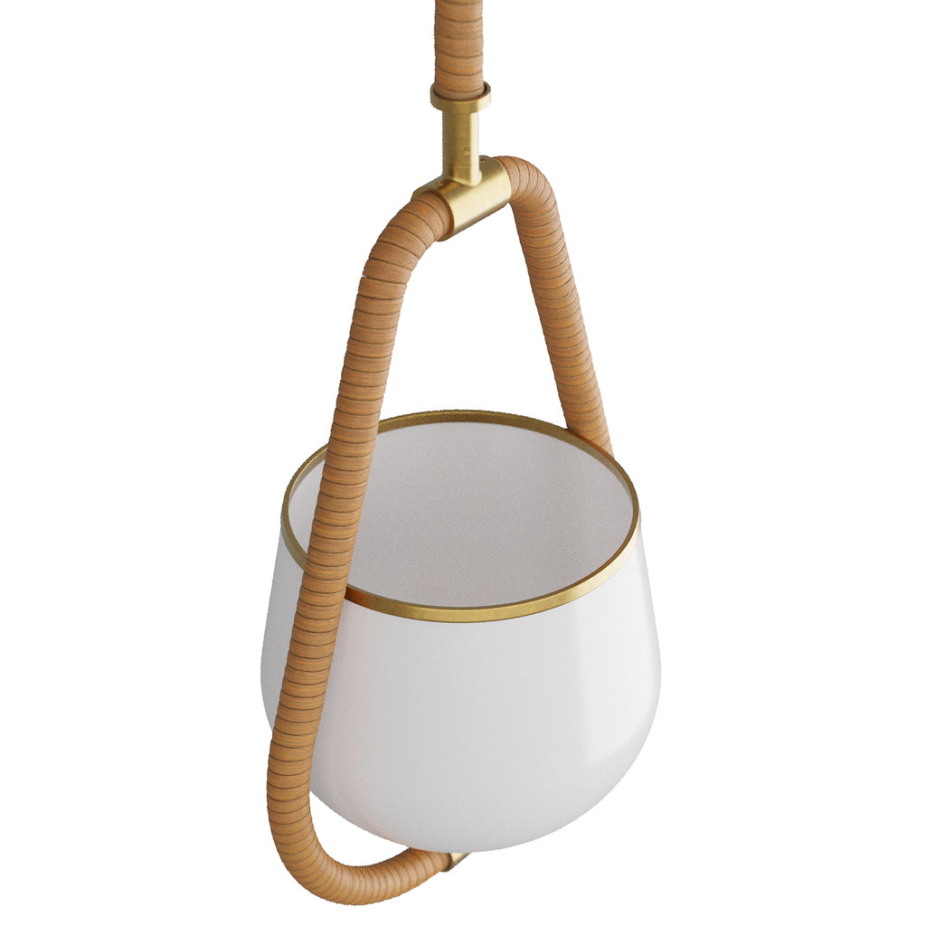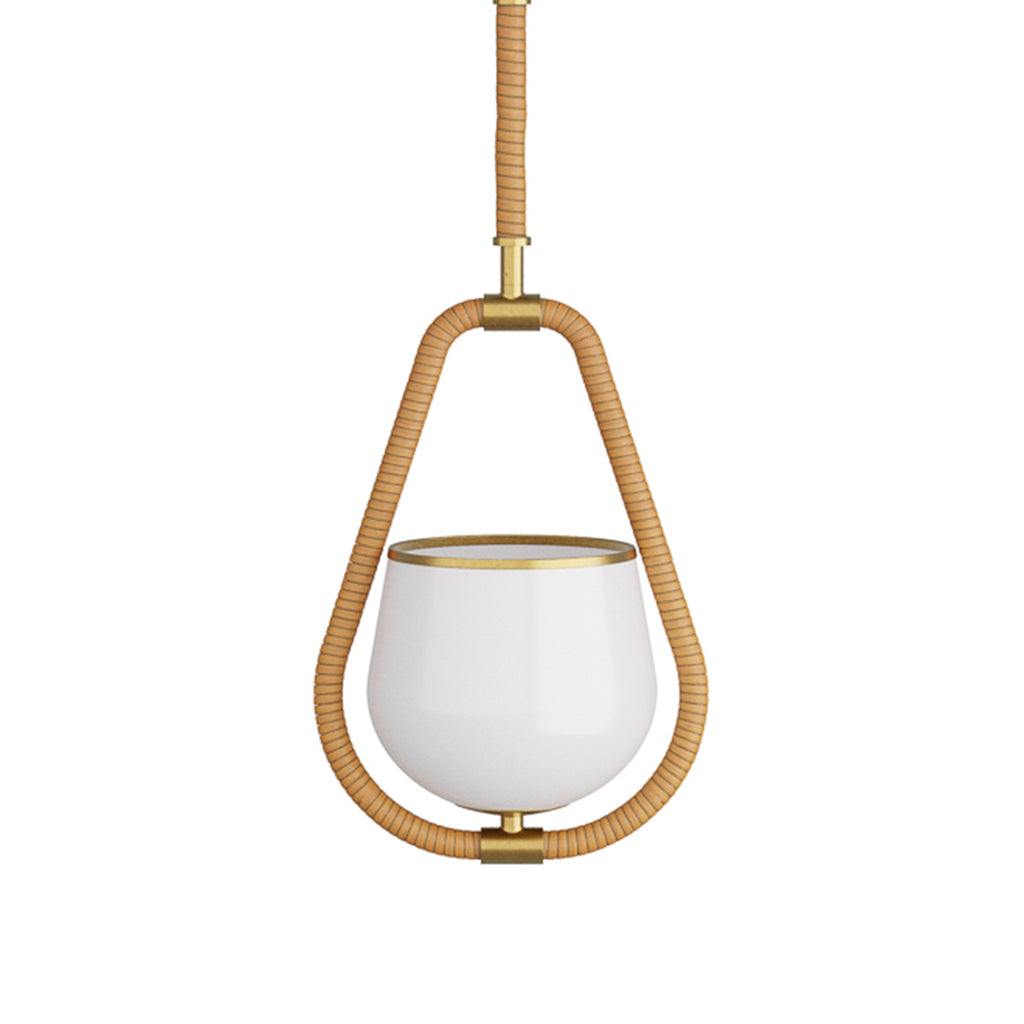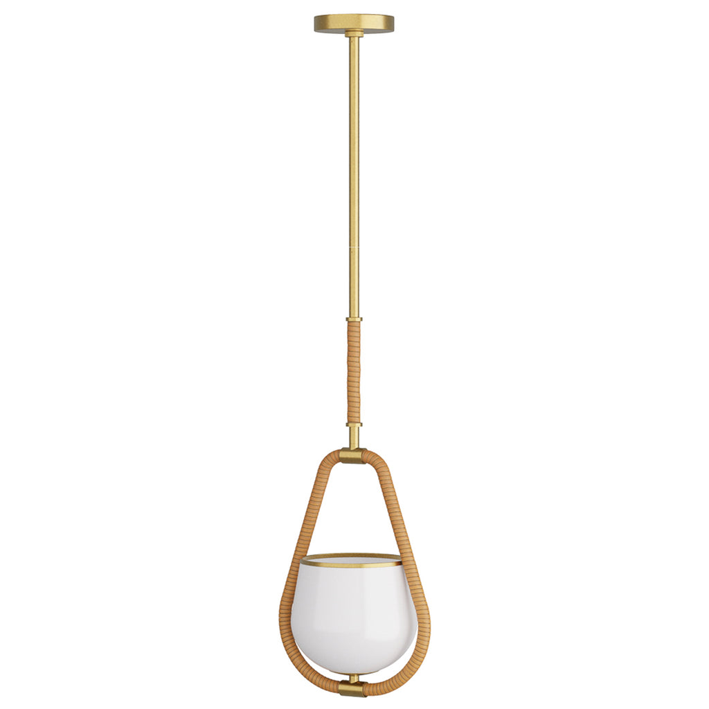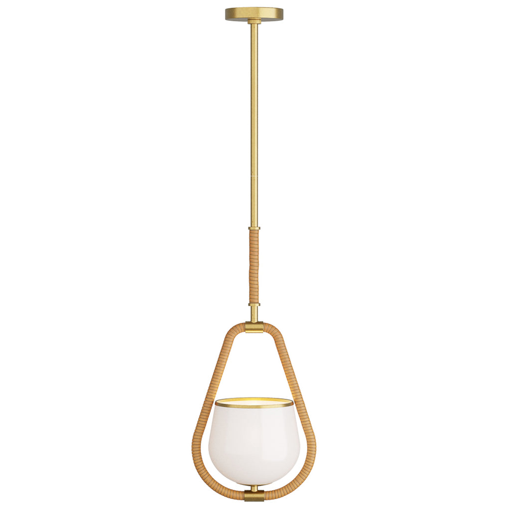 A traditional equestrian stirrup influenced a clever twist on a traditional pendant. Wrapped in natural rattan, its antique brass iron finished post cradles a bowl of opal glass trimmed with a matching metal stripe. Damp-rated, although limited covered outdoor conditions may affect finish. Finish will vary.