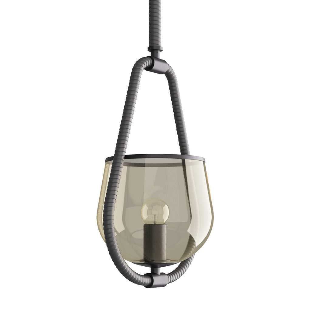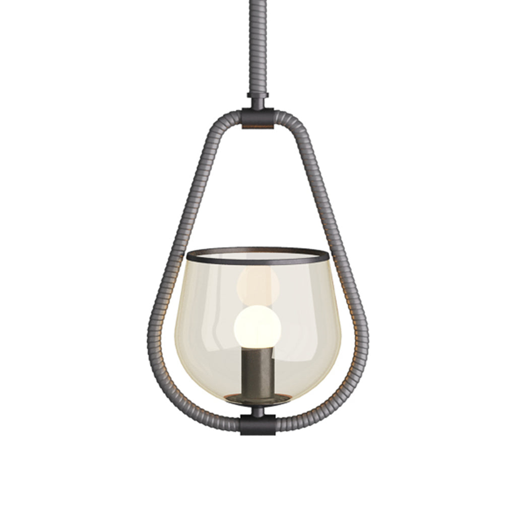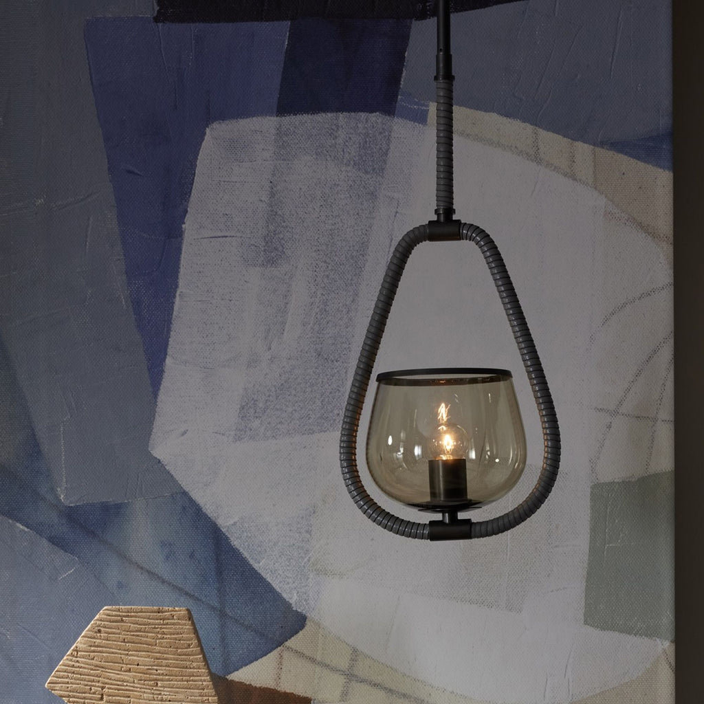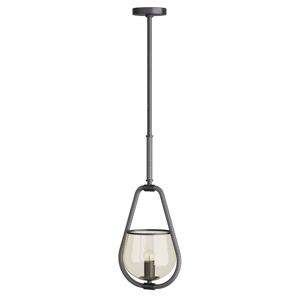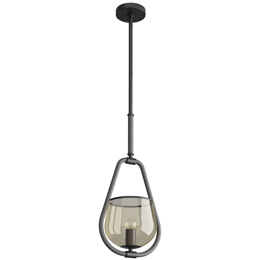 A traditional equestrian stirrup influenced a clever twist on a traditional pendant. Wrapped in natural rattan, its antique brass iron finished post cradles a bowl of opal glass trimmed with a matching metal stripe. Damp-rated, although limited covered outdoor conditions may affect finish. Finish will vary.